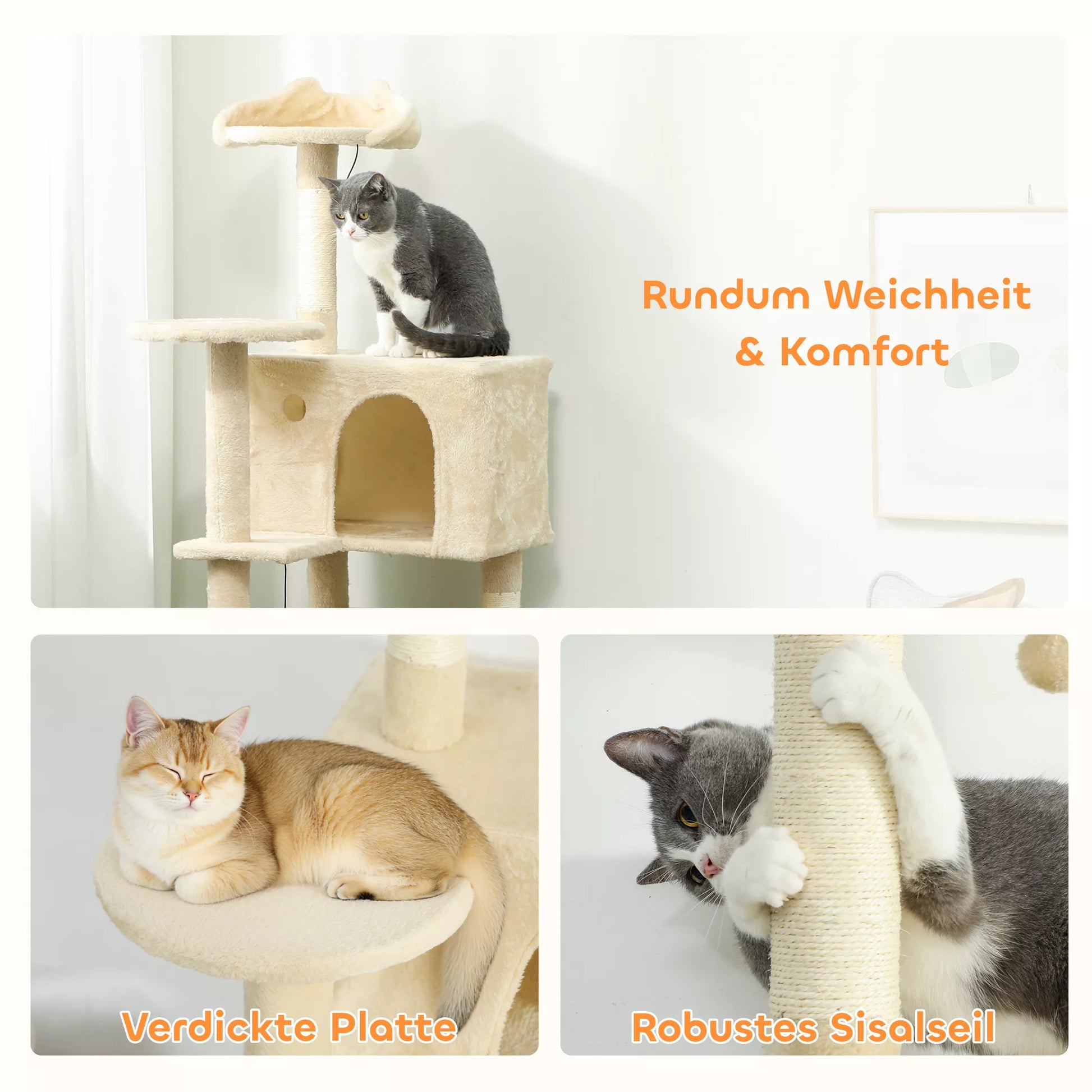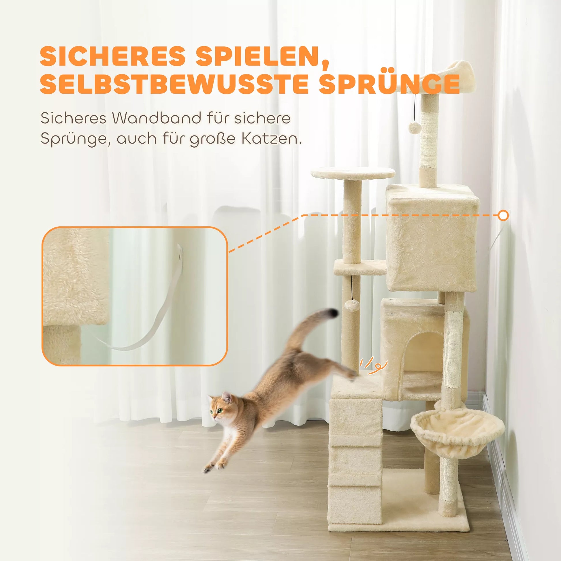 Kaķu skrāpēšanas stabs 160 cm Kaķu tornis ar šūpuļtīklu, kāpnēm, gultu, 2 plīša bumbiņām, sizala stieņiem, 48 x 48 x 160 cm, bēšs