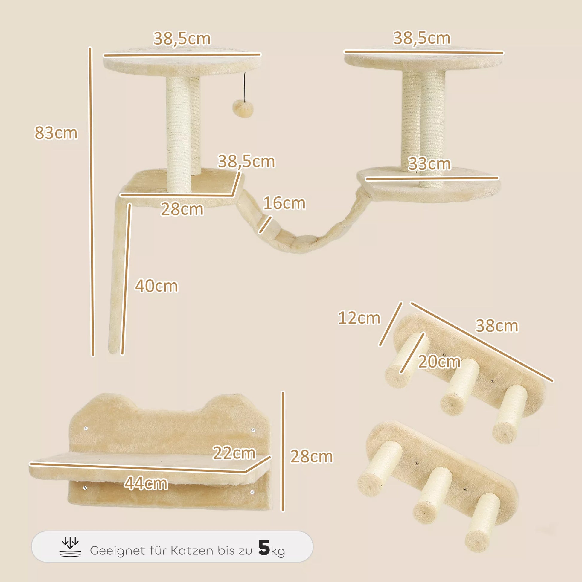 Kaķu kāpņu komplekts, stiprināms pie sienas un griestiem, kaķiem līdz 5 kg, bēšs