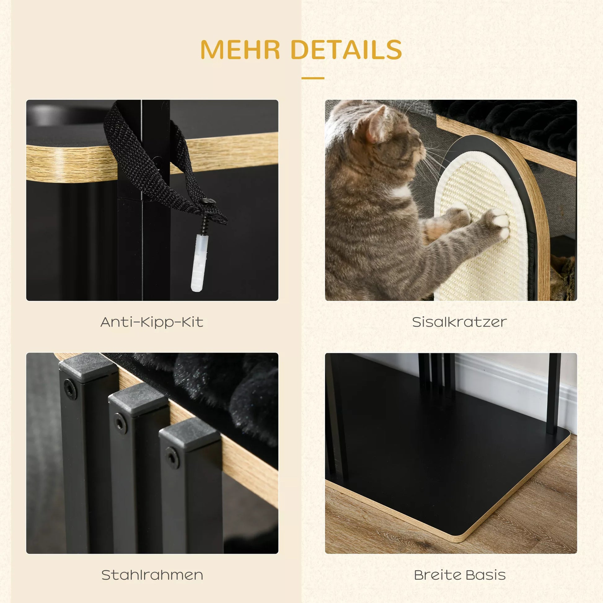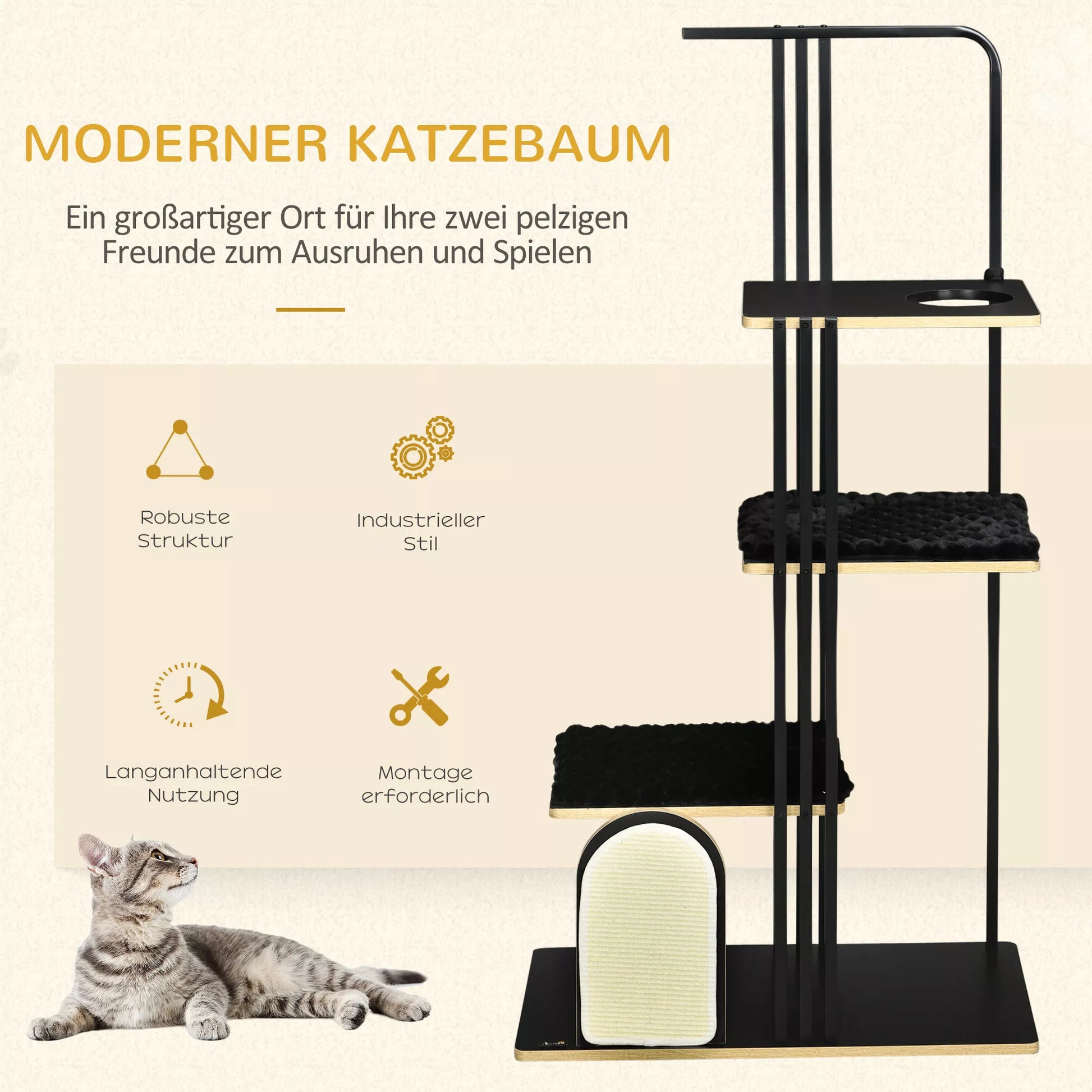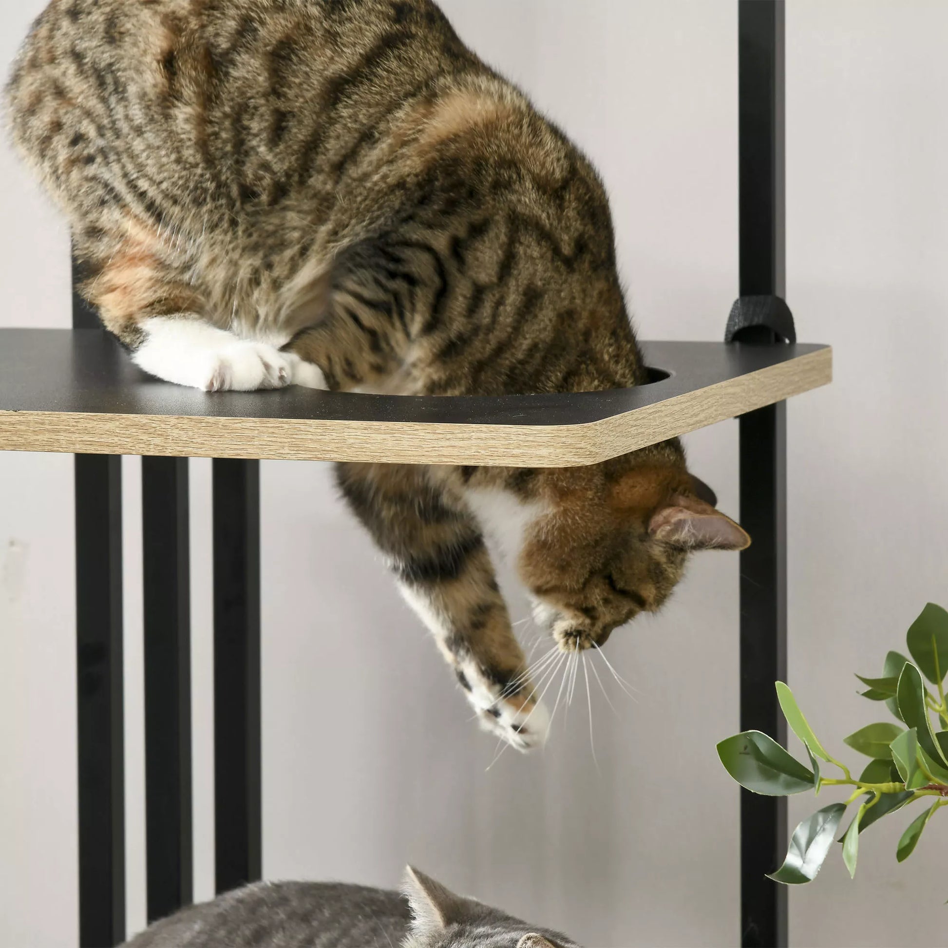 Kaķu māja, industriāls dizains, 3 platformas, 2 guļampapīri, skrāpējamā siena, tērauda rāmis, melna, 85 x 48 x 170 cm
