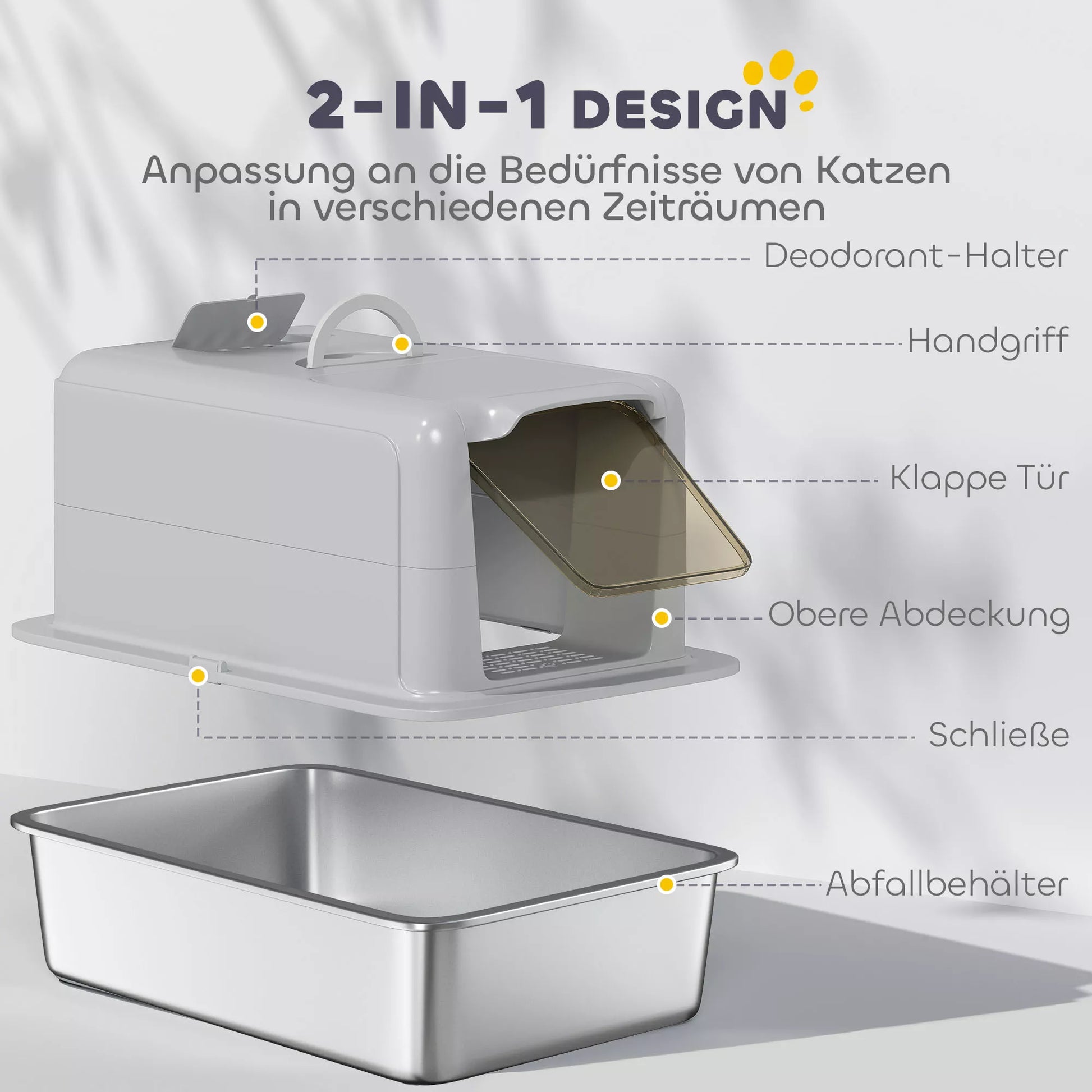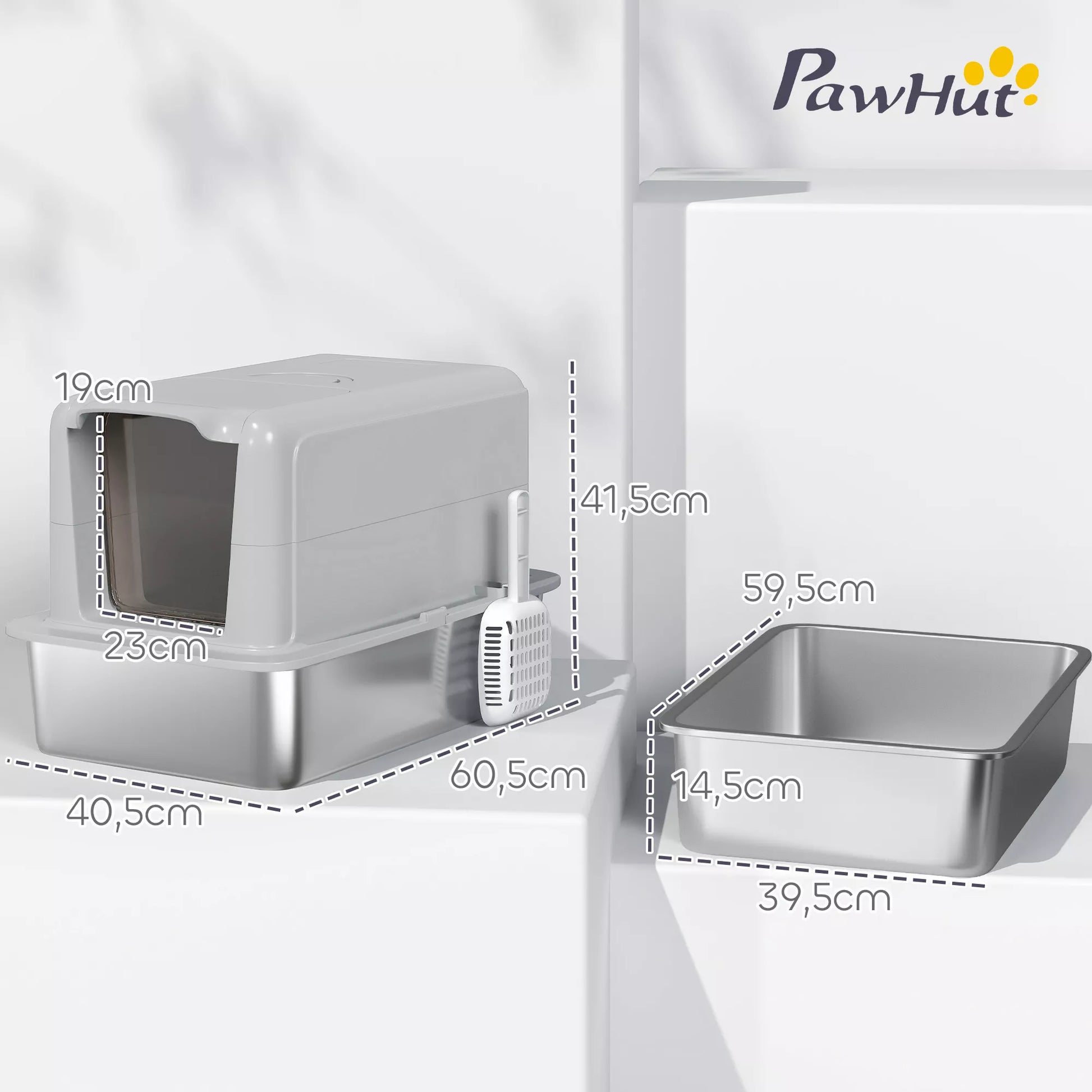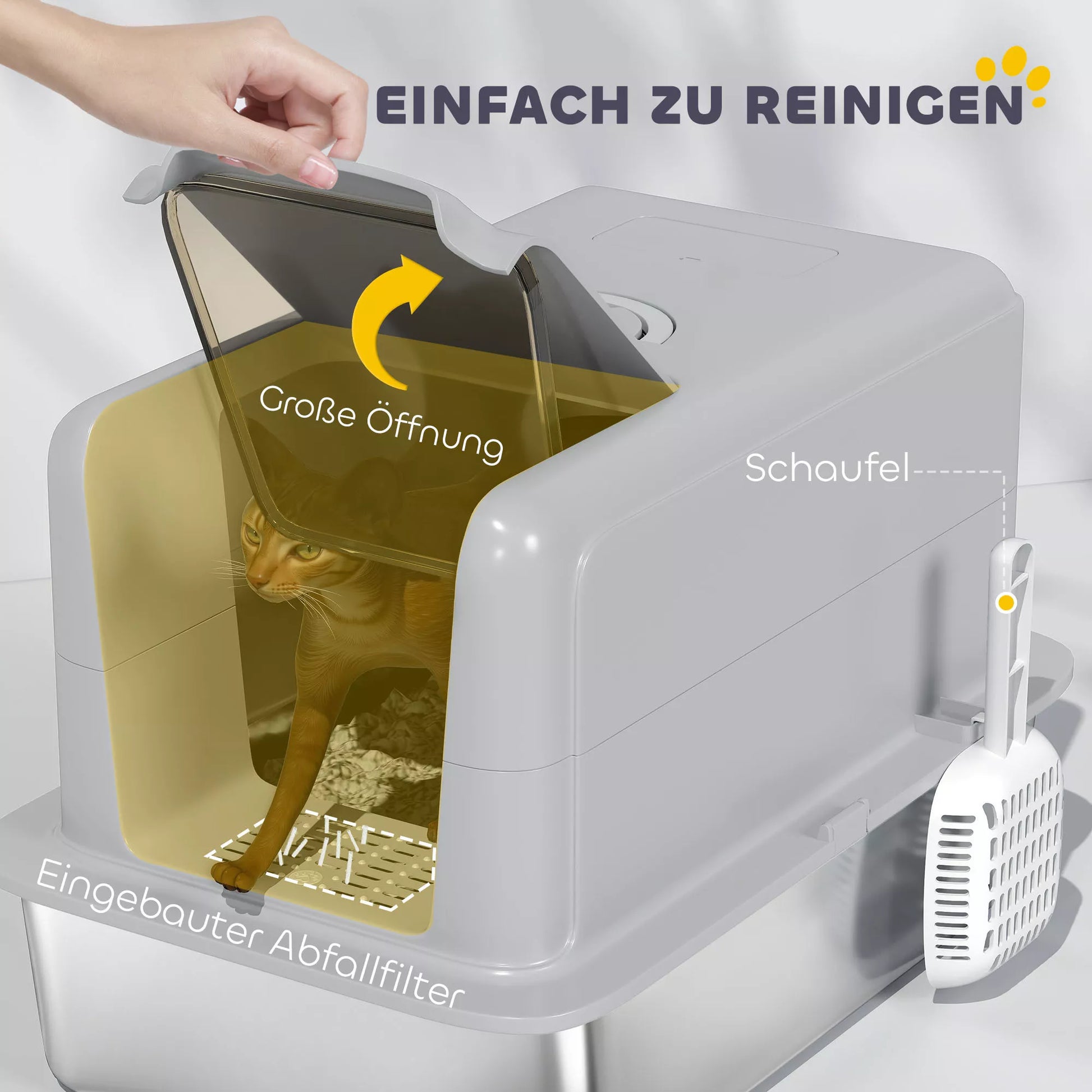 Kaķu pakaišu kaste, nerūsējošā tērauda konteiners, filtrs, kausiņa, kaķiem līdz 6 kg, 40,5 x 60,5 x 41,5 cm, pelēka/sudrabaina