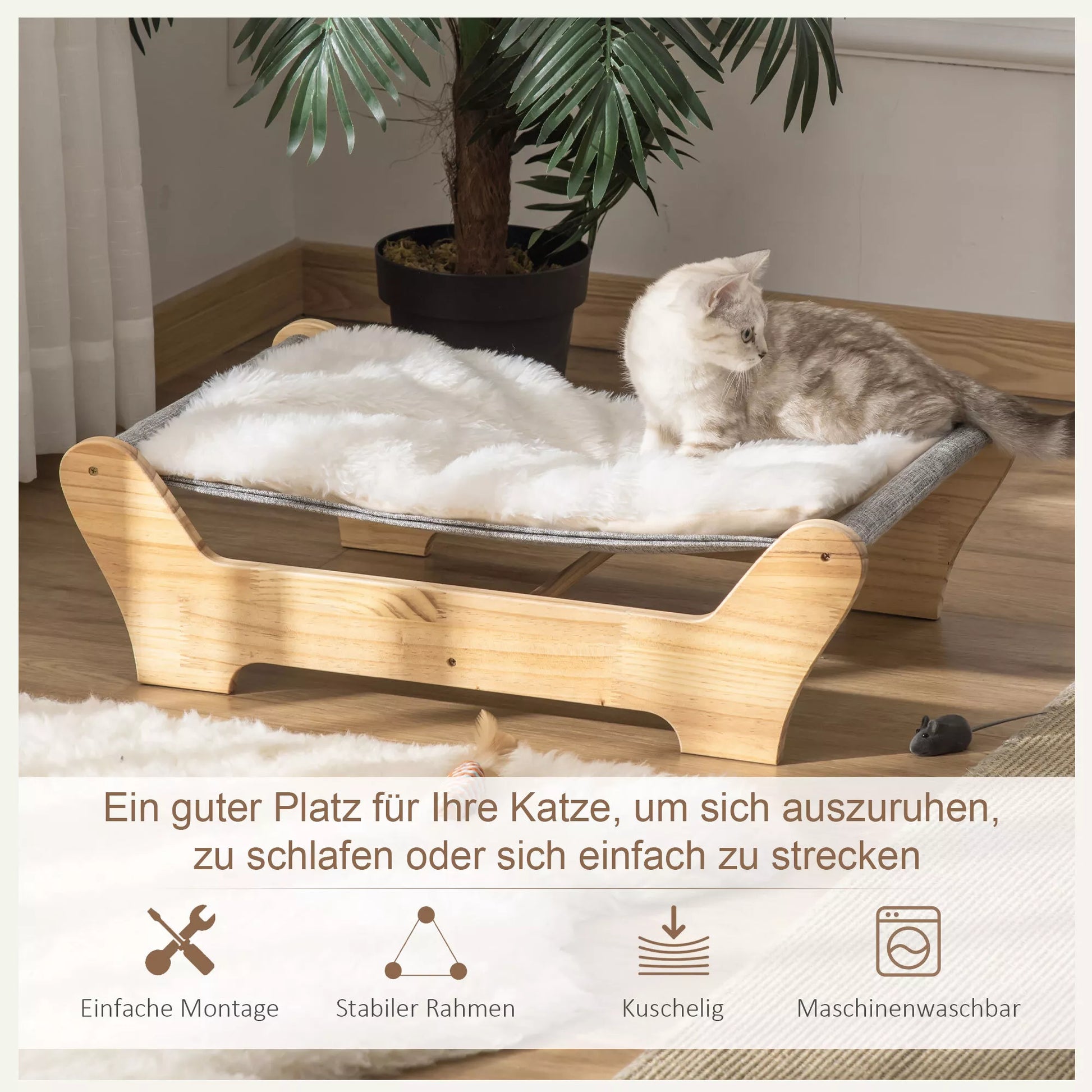 - ✔ Izgatavota no priedes koka, šī kaķu gulta ir izturīga un ilgmūžīga