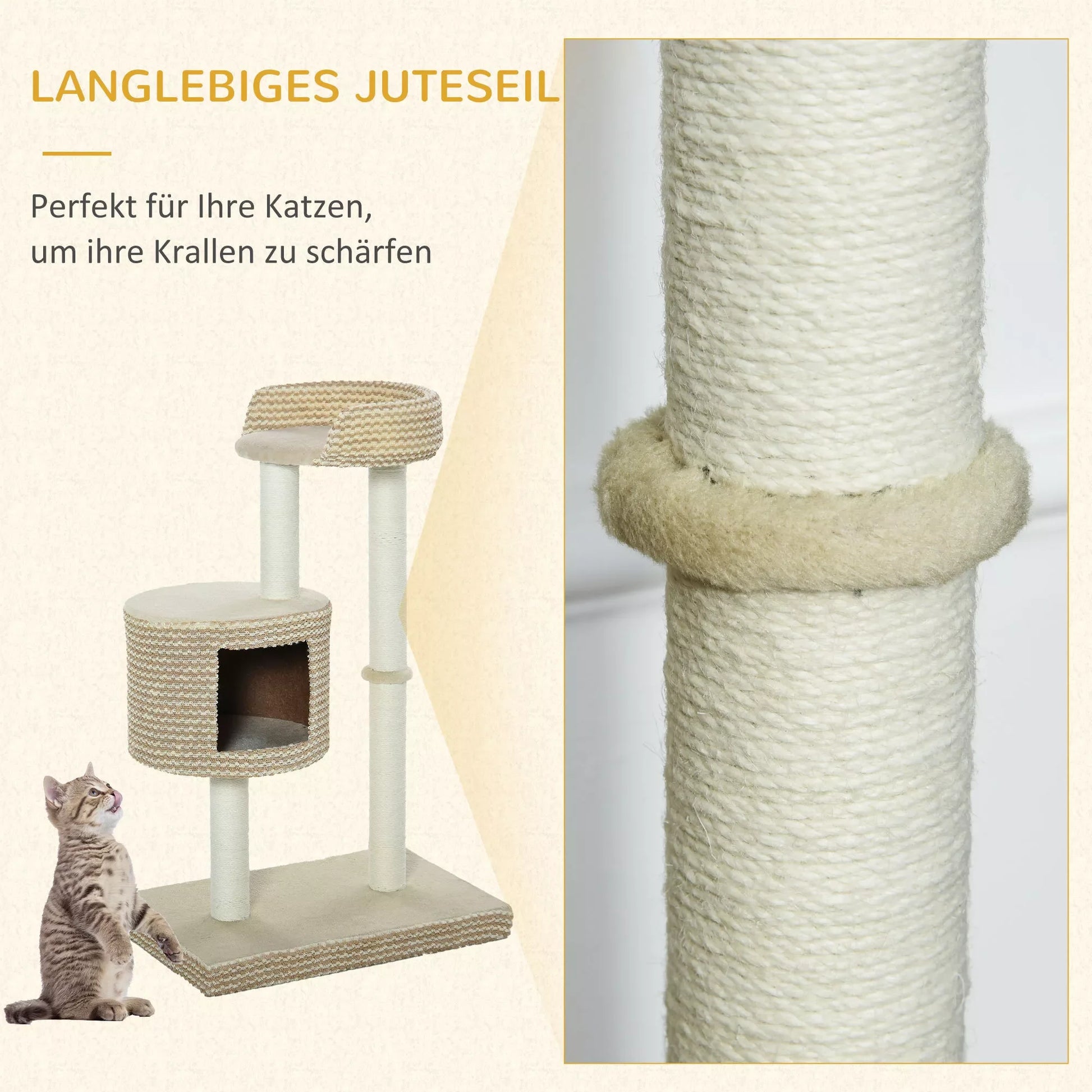 Kaķu koks, skrāpējamais stabs, kāpšanas koks, mīkstas skatu platformas, bēšas un kafijas krāsas, skaidu plātne, plīša, džutas, 61x41x96 cm