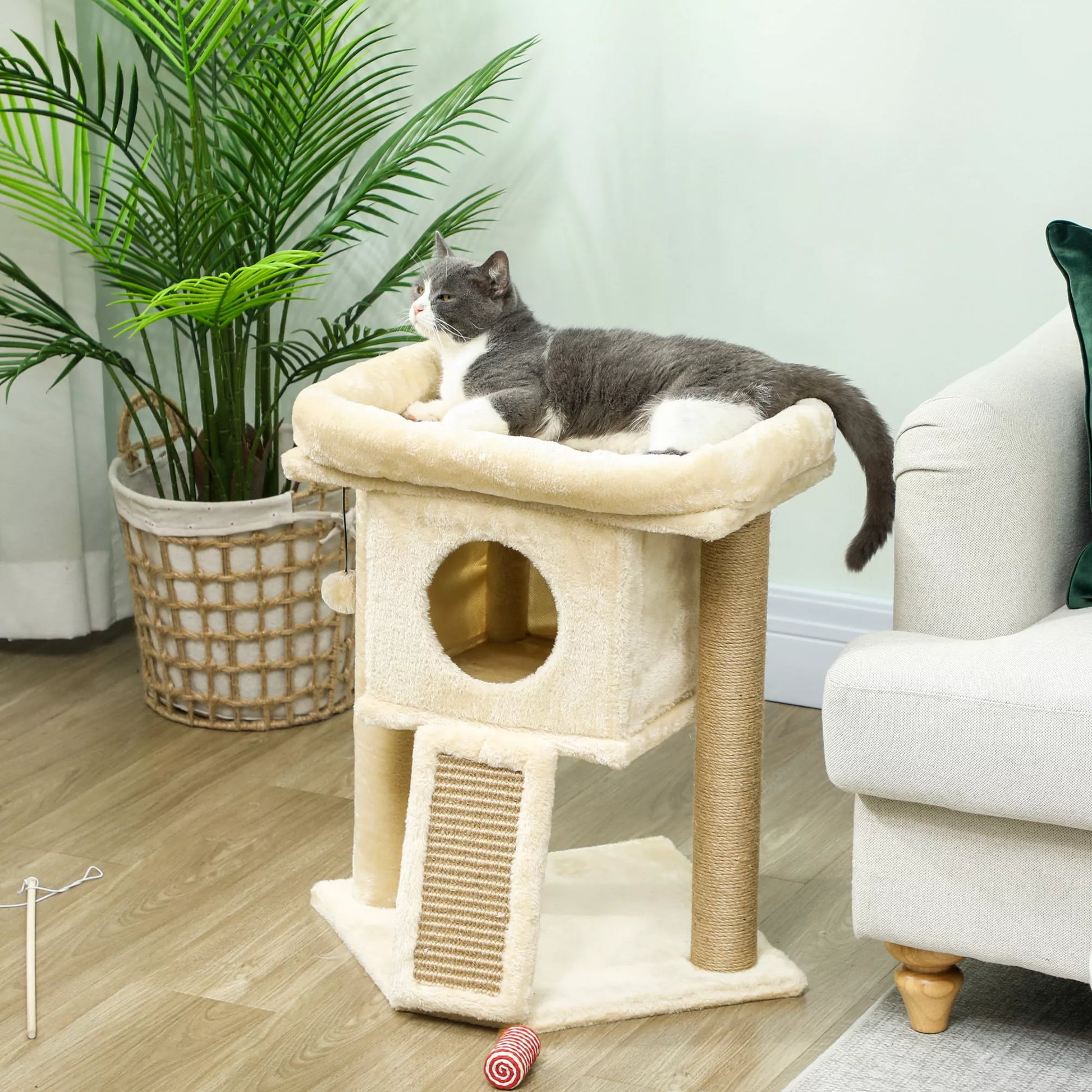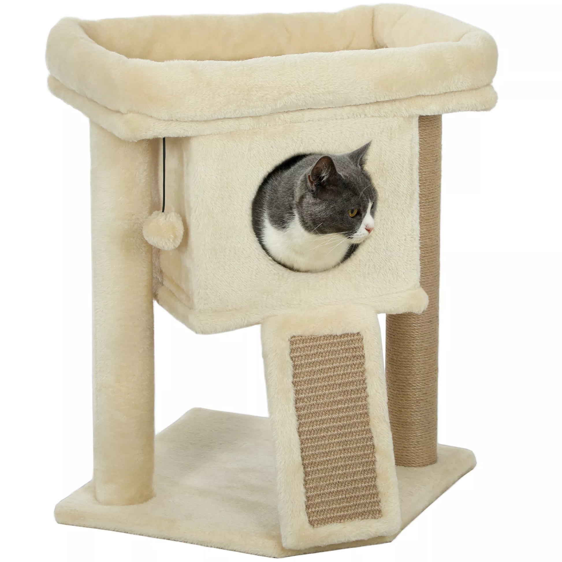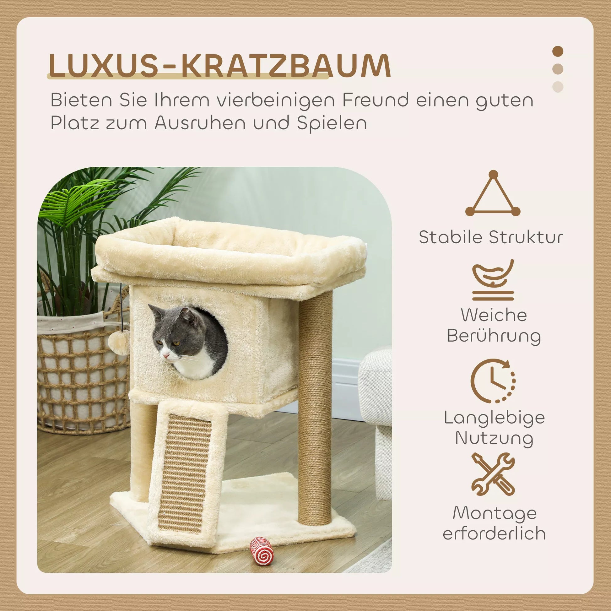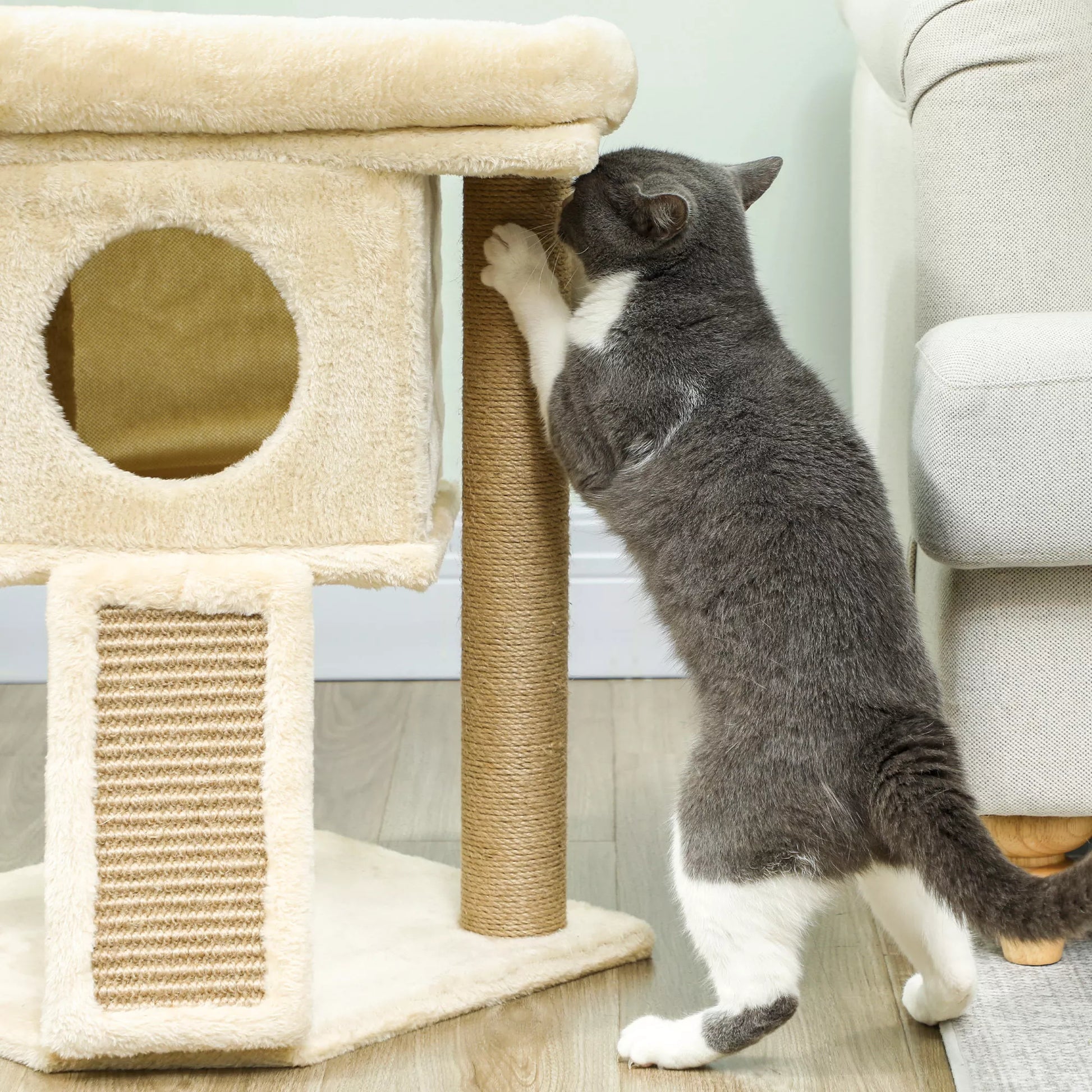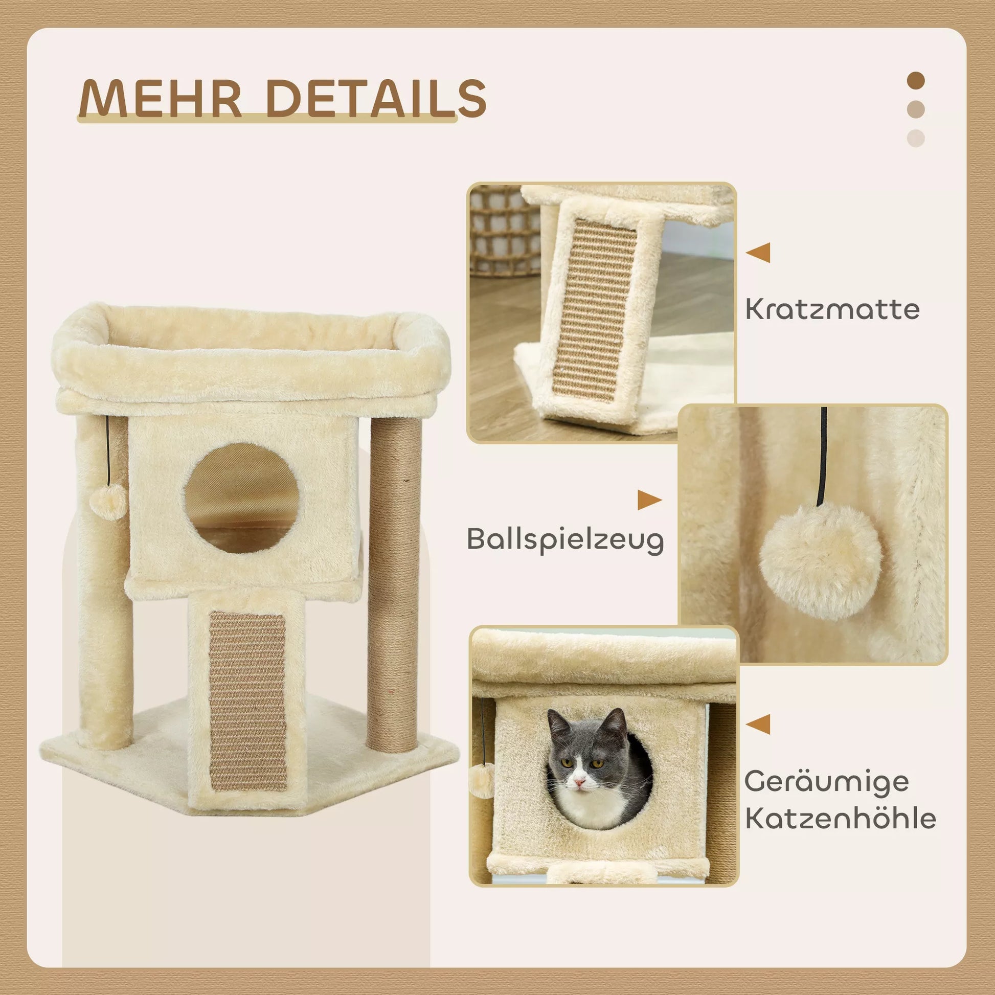 Kaķu māja ar džutas skrāpējamo stabu, guļamplatforma, rotaļu bumba, kaķu mājiņa, bēša, 40 x 40 x 57 cm