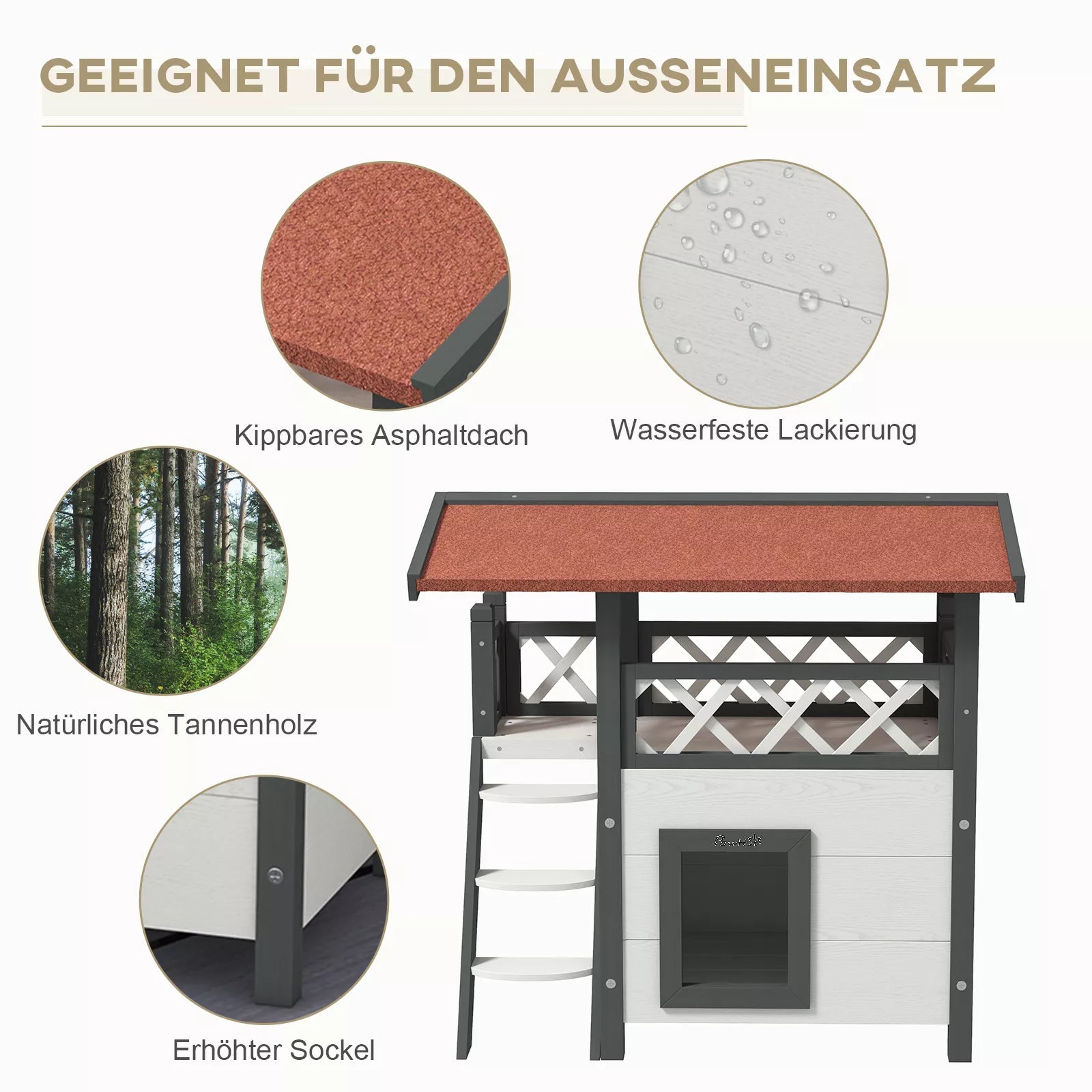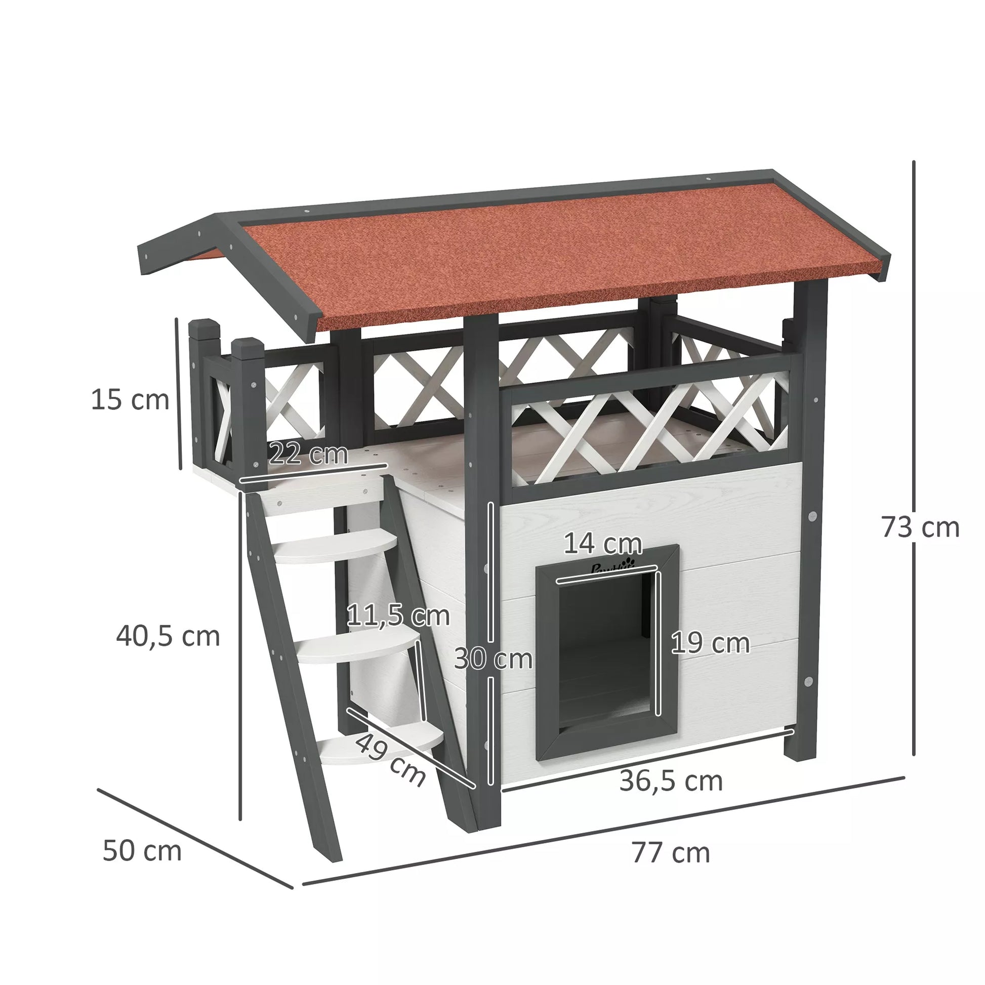 Mūsu divstāvu kaķu māja "PawHut" ir ideāli piemērota maziem pūkainiem kaķiem. Kaķu mājai ir asfalta jumts un ūdensizturīga krāsa, kas padara to ūdens un laikapstākļu izturīgu. Mājā ir trīs kaķu gultas, lecamauklas, durvis un jautra ieeja jūsu kaķim. Apakšējo alu var izmantot kā kaķu tualeti. Šī kaķu māja ir brīnišķīgas mājas jūsu kaķim.