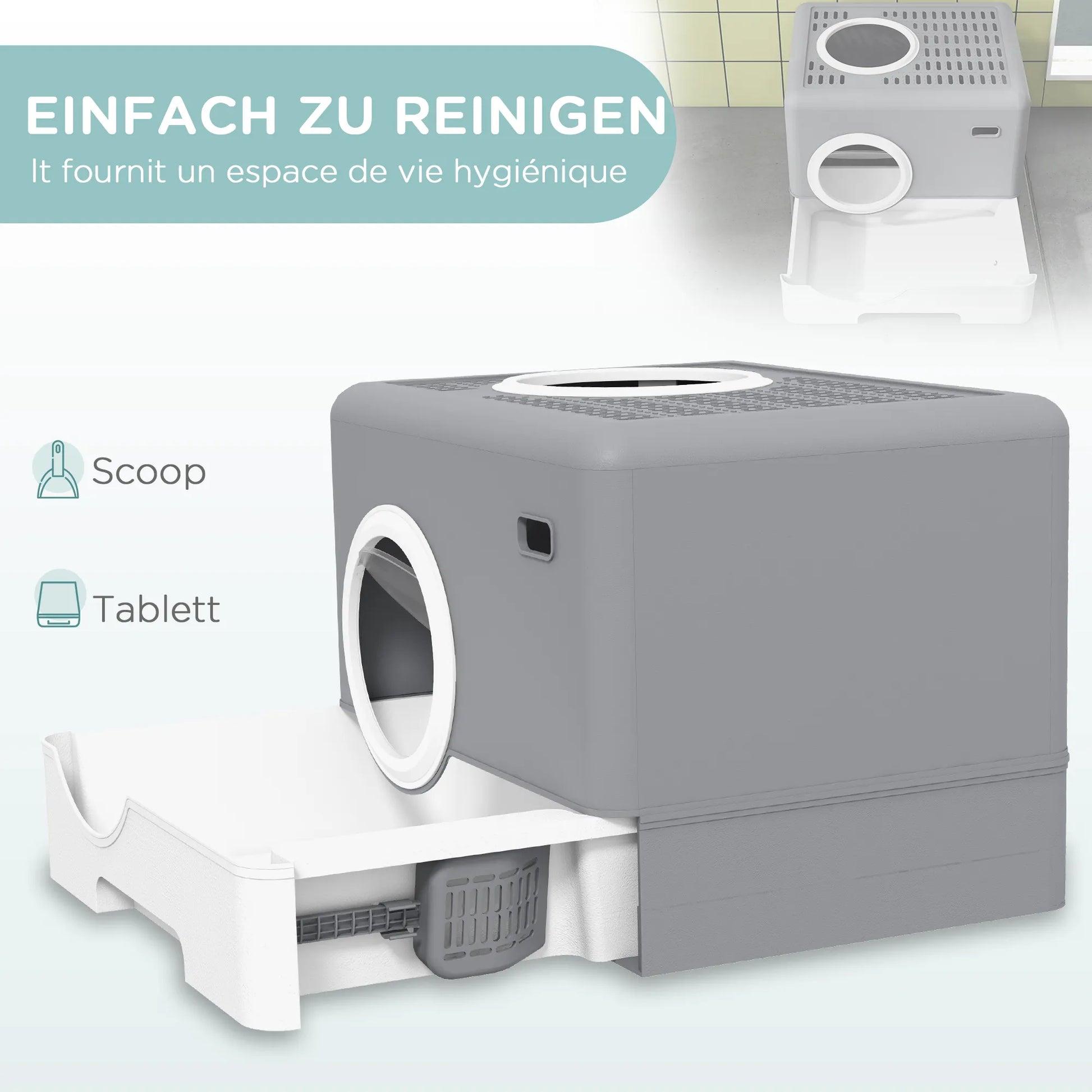 Ideāla privāta oāze ir kaķu tualete. Plašā, bet diskrētā, eleganti veidotā telpa piedāvā daudz privātuma un vietas kaķiem. Vienkārši izvelciet atvilktni tīrīšanai – nekādu atkritumu, nekādu problēmu. Kaķi iekļūst kastē no priekšpuses un izkļūst no augšas, samazinot kaķu tualetes izbiršanu. Ar ventilējamu jumtu un trim apkārtējām sienām šī greznā gulta sniegs jūsu mīlulim mieru un relaksāciju.