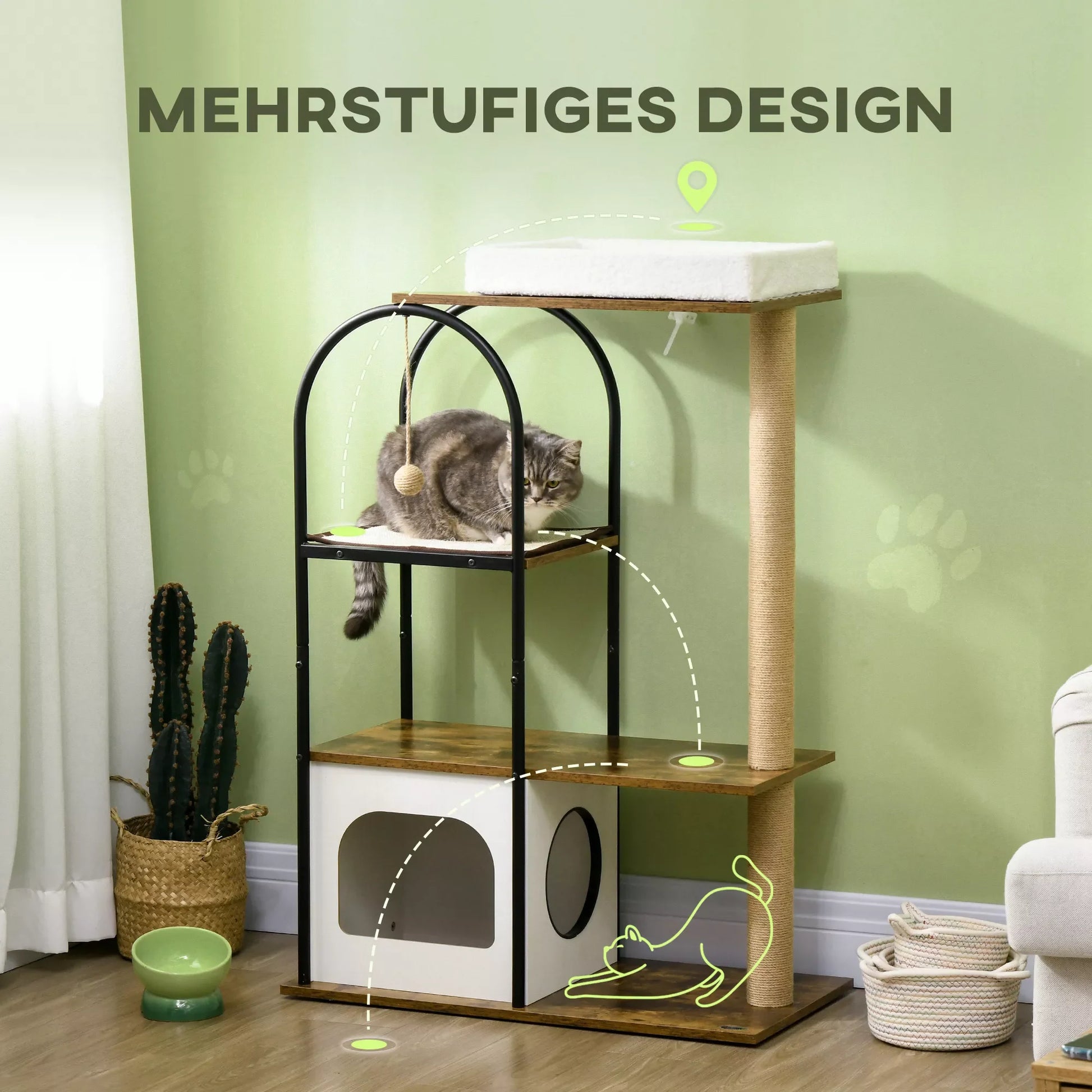 Kaķu māja, 4 stāvu, kaķu mājiņa, rotaļu bumba, pret apgāšanos, 80x40x118,5 cm, brūna/balta