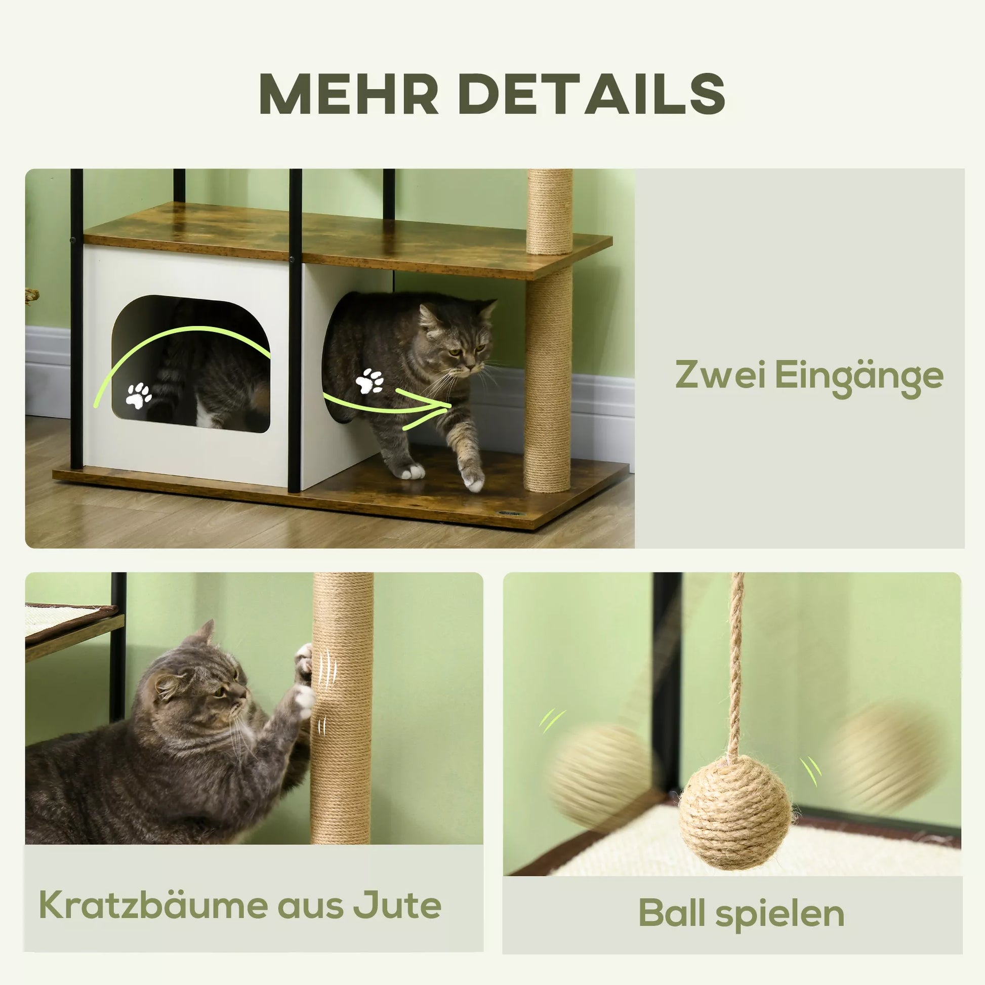 Lieliska kaķa izklaide ar skrāpējamo stabu! Ar četriem līmeņiem un 118,5 cm augstumu tas piedāvā jūsu kaķim īstu kāpšanas paradīzi. Mājīgā mājiņa augšējā stāvā un kaste ar divām ieejām apakšā ir ideāli piemērotas 1-2 kaķiem līdz 5 kg. Sizala aptintie skrāpējamie stabi ir lieliski piemēroti nagu asināšanai un kaķa atturēšanai no mēbelēm. Piekaramā rotaļu bumba nodrošina papildu izklaidi.