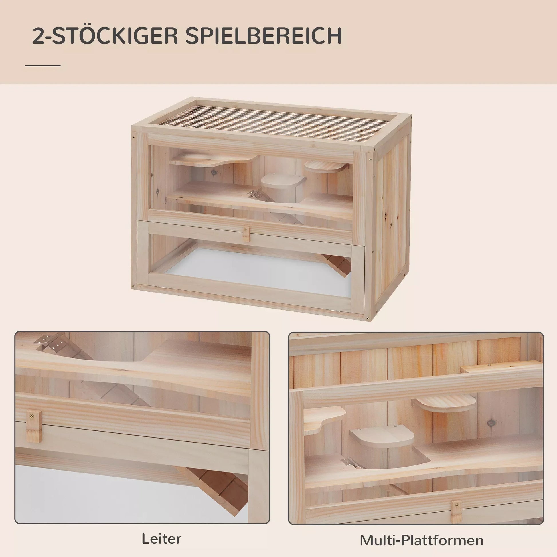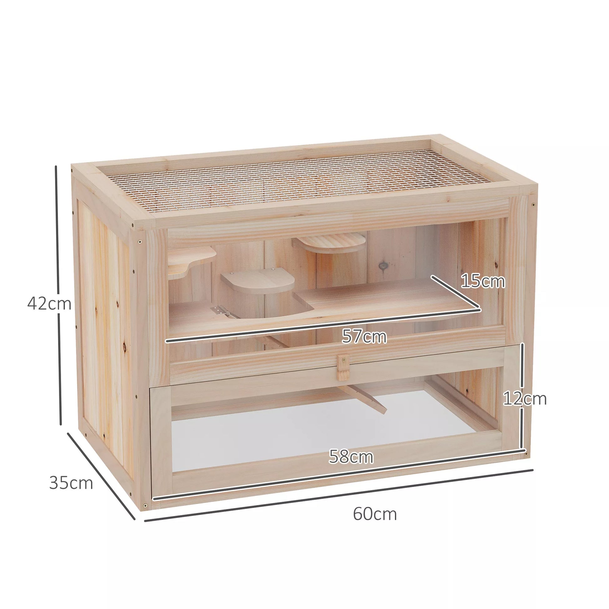 Mūsu mājīgais grauzēju būris nodrošina visu nepieciešamo jūsu mazajam! Divos līmeņos, kas savienoti ar rampu, jūsu mīlulis atradīs skaistas mājas spēlēšanai, paslēpšanai un izpētei. Koka būrim ir jumta logs un priekšējais atverams vāks, lai jūs varētu viegli izņemt un paglaudīt savu mīluli. Tas arī atvieglo būra tīrīšanu. Turētājs būra kreisajā sienā ir paredzēts ūdens pudelei.
