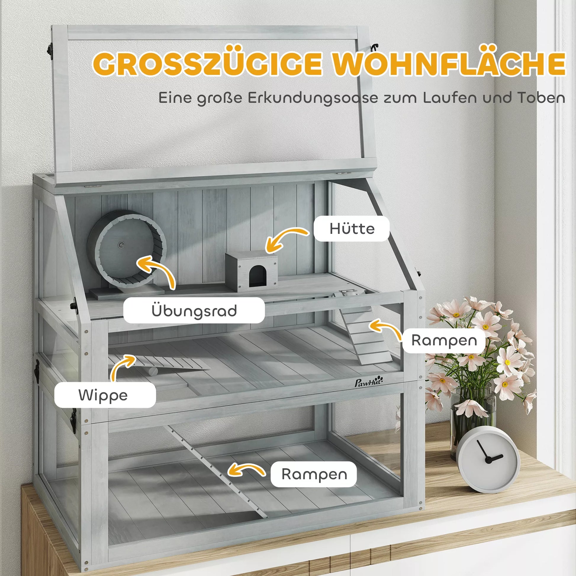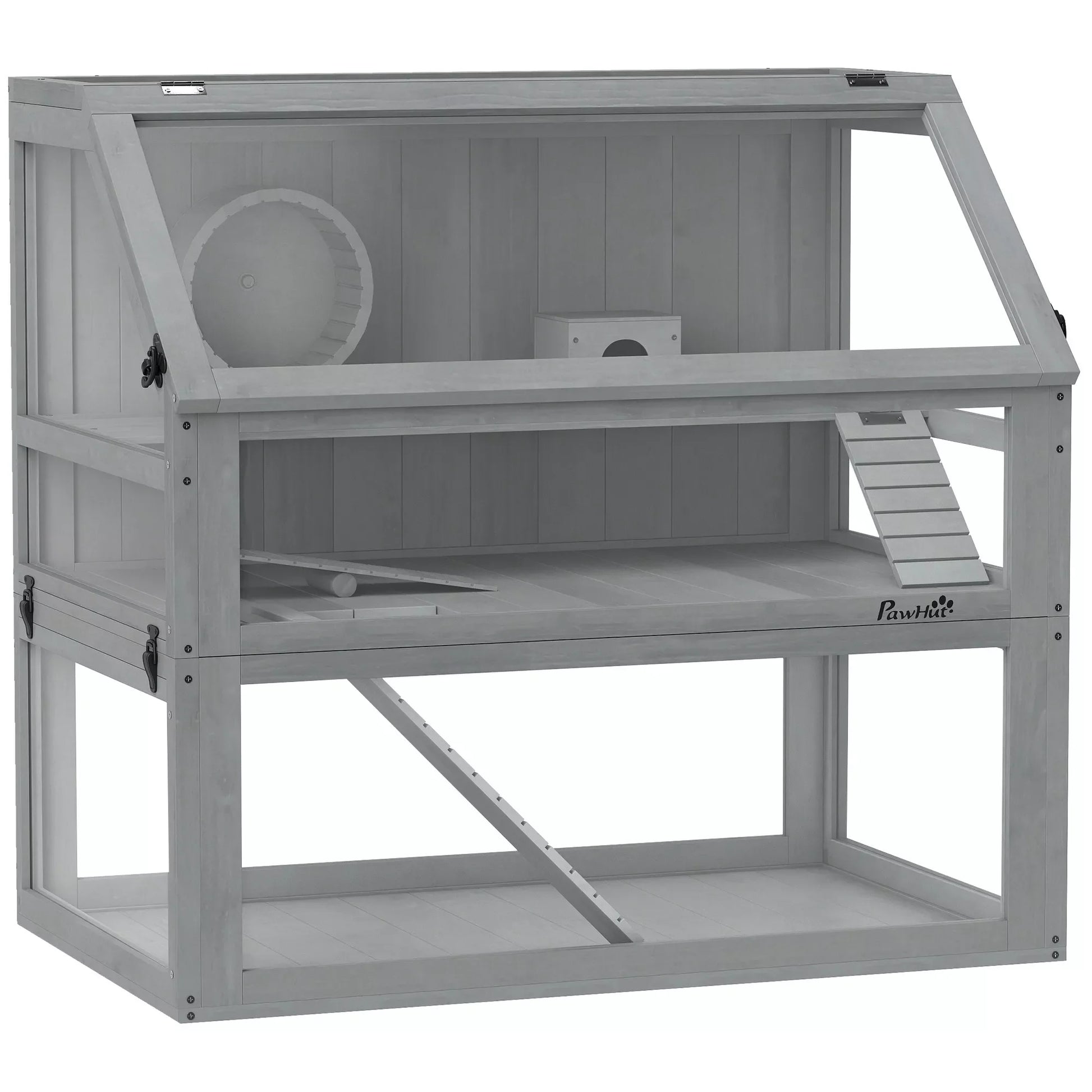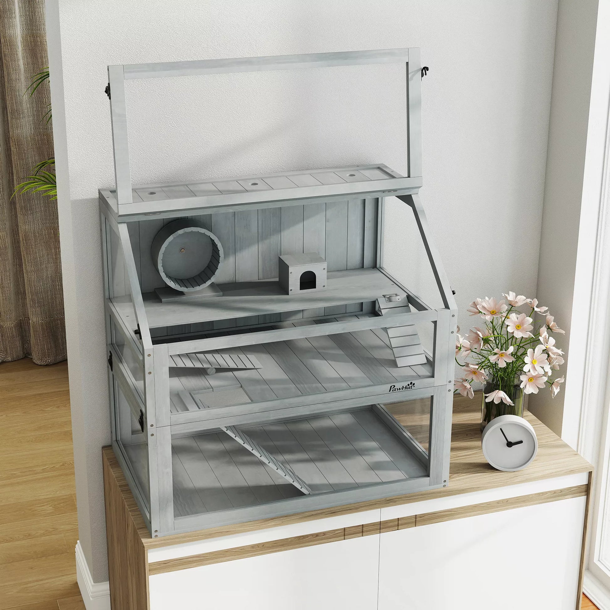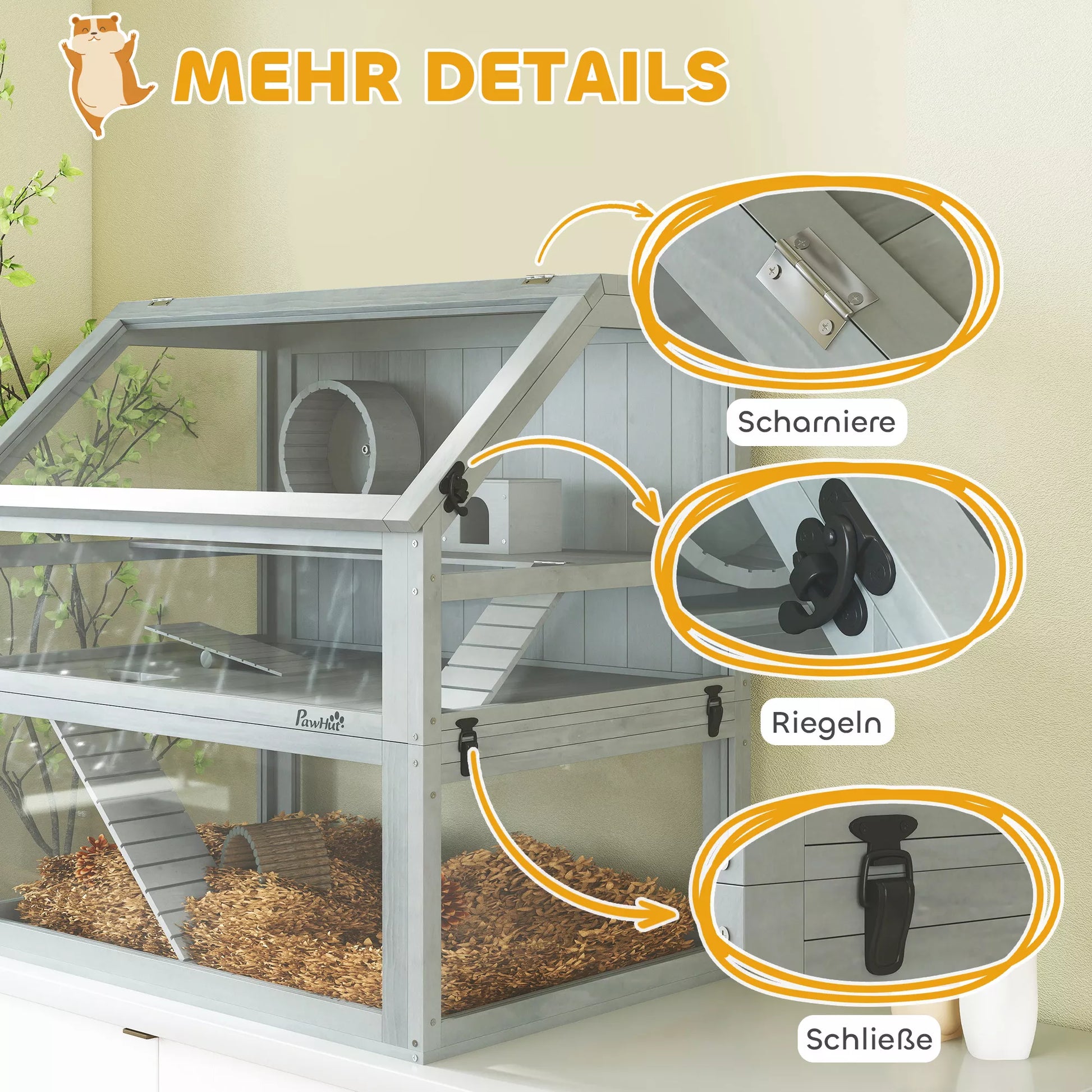 Koka māja kāmīšiem, 3 stāvu ar lielu dibenu, noņemamiem līmeņiem, maziem dzīvniekiem, 80x50x76cm, gaiši pelēka
