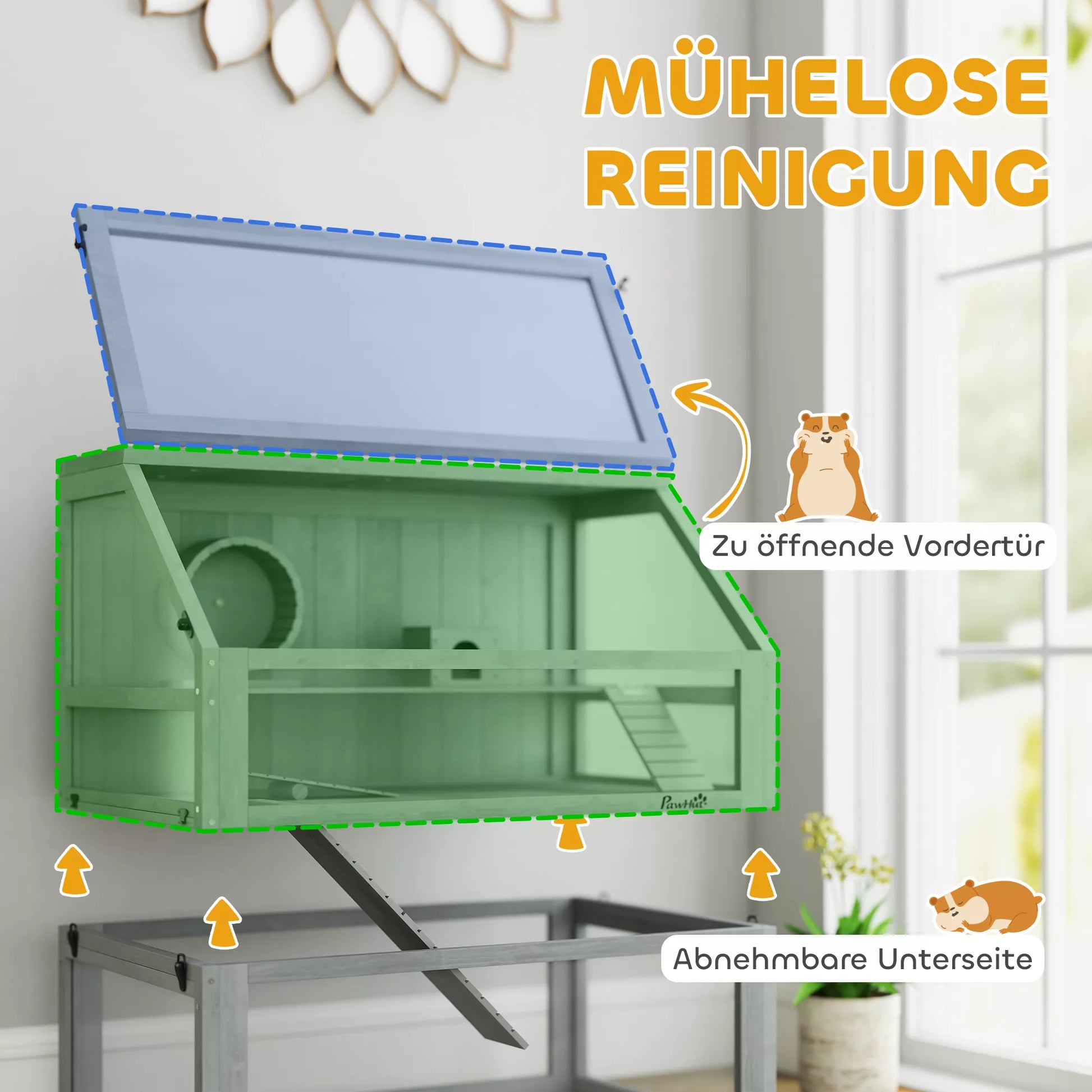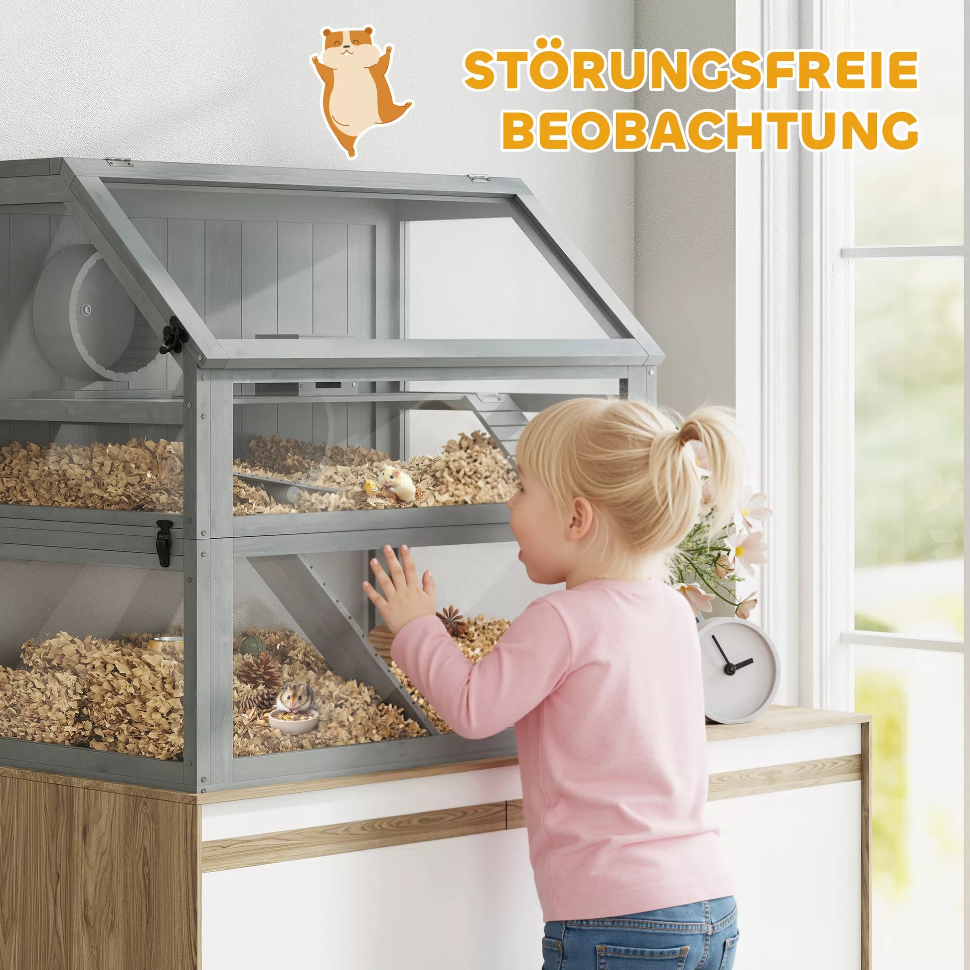 Kāmja būris nodrošina jūsu mazajam draugam dabisku un daudzslāņainu dzīvotni. Ar integrētu kāmīti, šūpolēm un riteni katra diena kļūst par prieka un aktivitātes pilnu piedzīvojumu. Ērta tīrīšana un novērošana caur lielajām durvīm un caurspīdīgajiem akrila paneļiem ļauj pastāvīgi uzraudzīt jūsu mīluļa veselību. Stilīgs dizains un augstas kvalitātes materiāli nodrošina drošību un harmonisku ikdienas dzīvi.