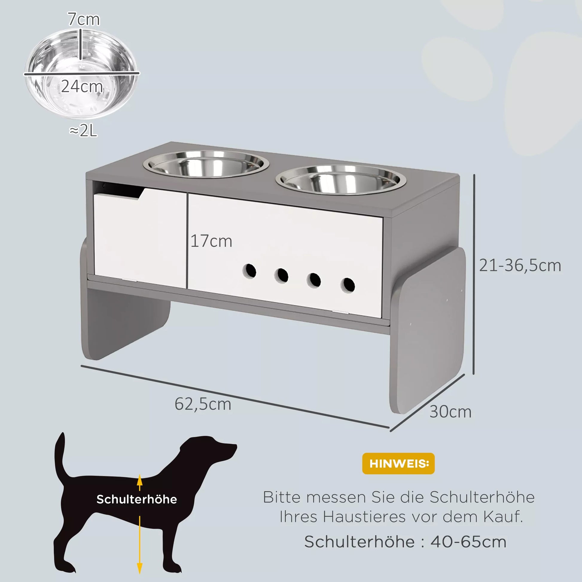 Uzlabojiet sava suņa uzturu ar suņu bļodu. Šajā suņu bļodu komplektā ir divas nerūsējošā tērauda bļodas uz paceltas pamatnes, kas ir ideāli piemērotas vidēja un ļoti liela auguma suņiem. Ar sakodiena aizsargu, kas palīdz uzlabot gremošanu, un regulējamu augstumu (21 cm, 30 cm, 36,5 cm), lai pielāgotos jūsu mājdzīvnieka augšanai. Komplektā ir arī slēpts nodalījums uzkodām un citiem aksesuāriem!