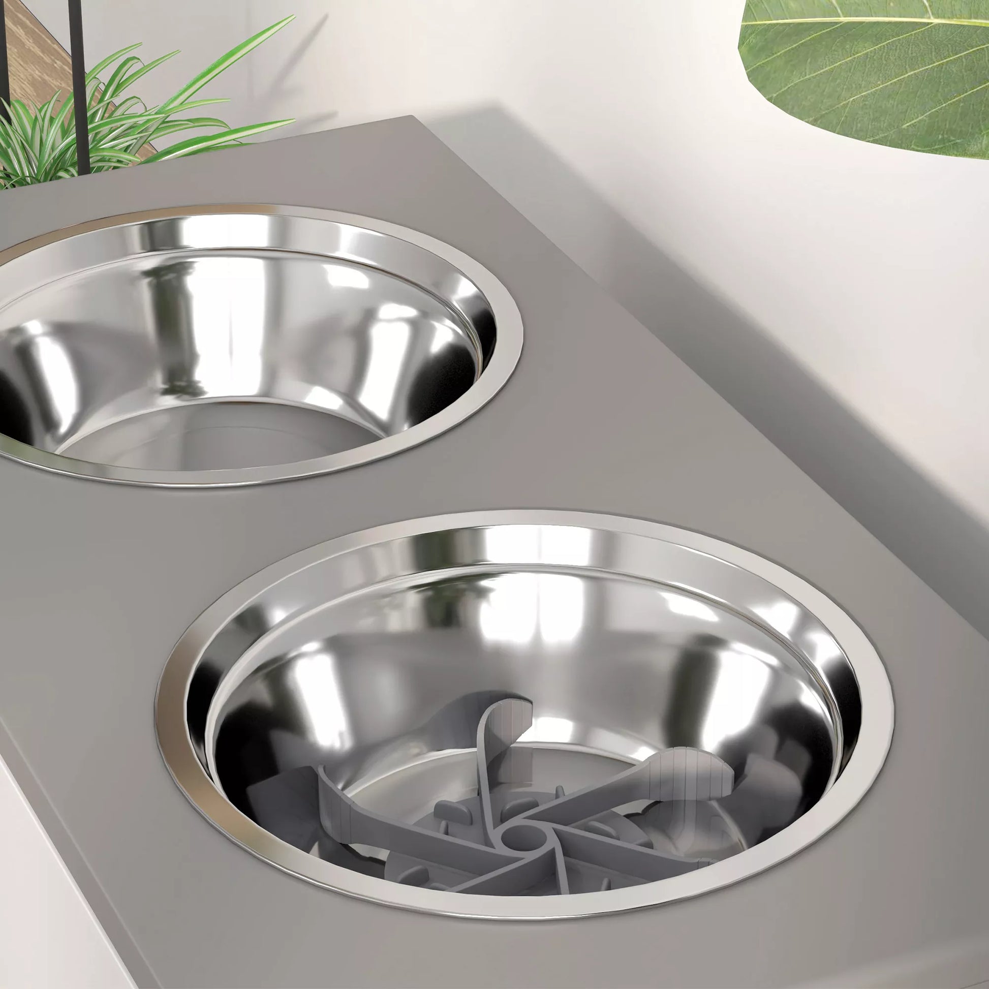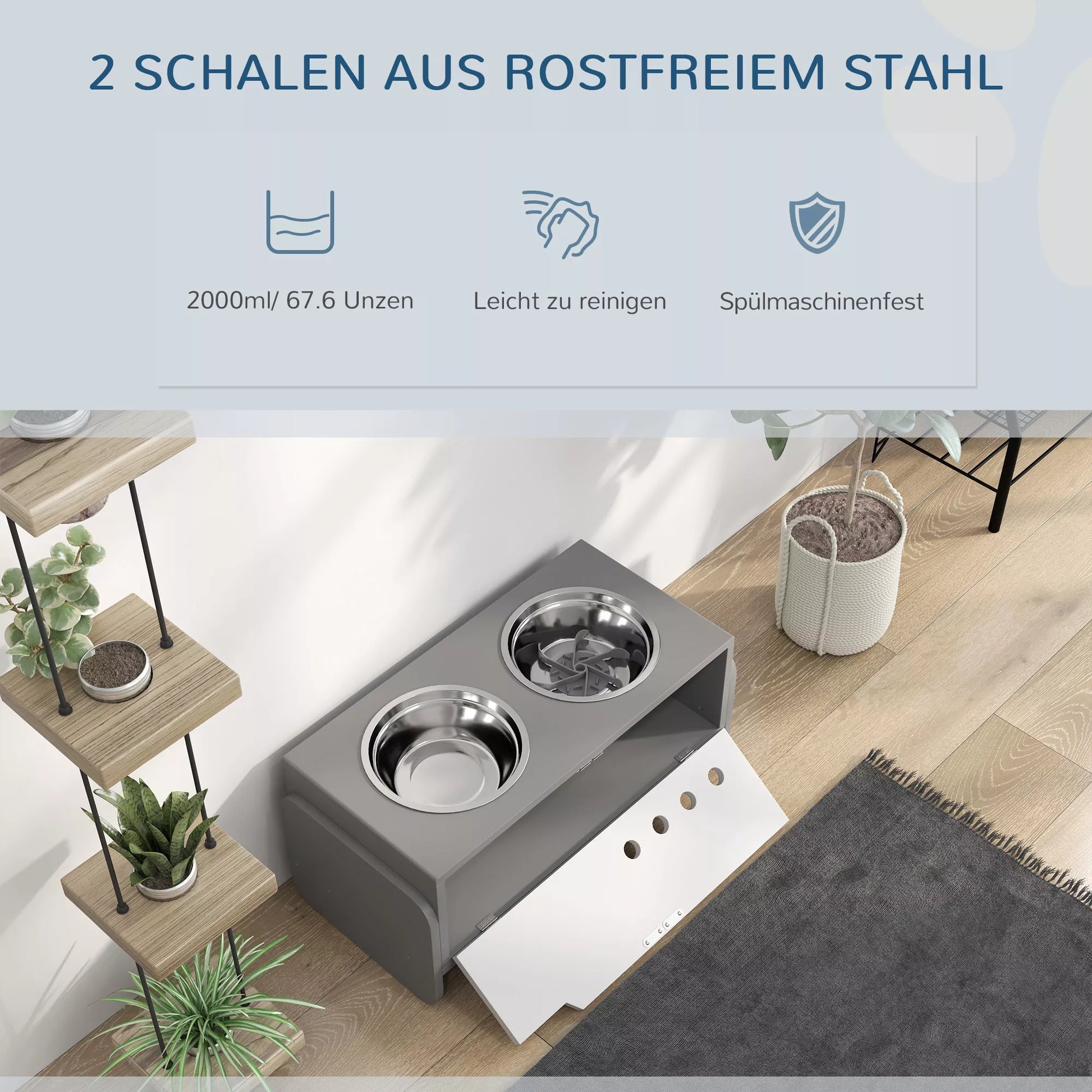 Pacelts suņu barotava ar uzglabāšanas kasti un lēnas barošanas paklājiņu, 2 x 2000 ml nerūsējošā tērauda bļodas, pelēka