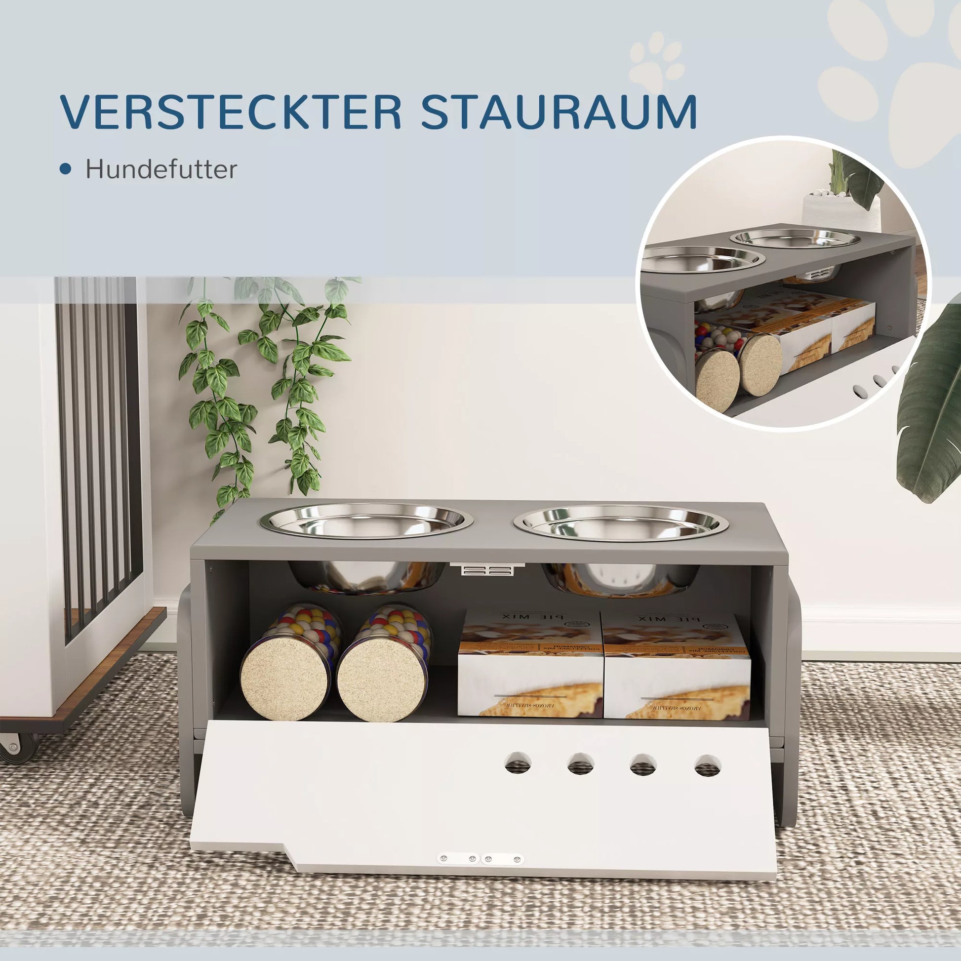 - ✔ Slēpts nodalījums mājdzīvnieku barības un aksesuāru glītai glabāšanai