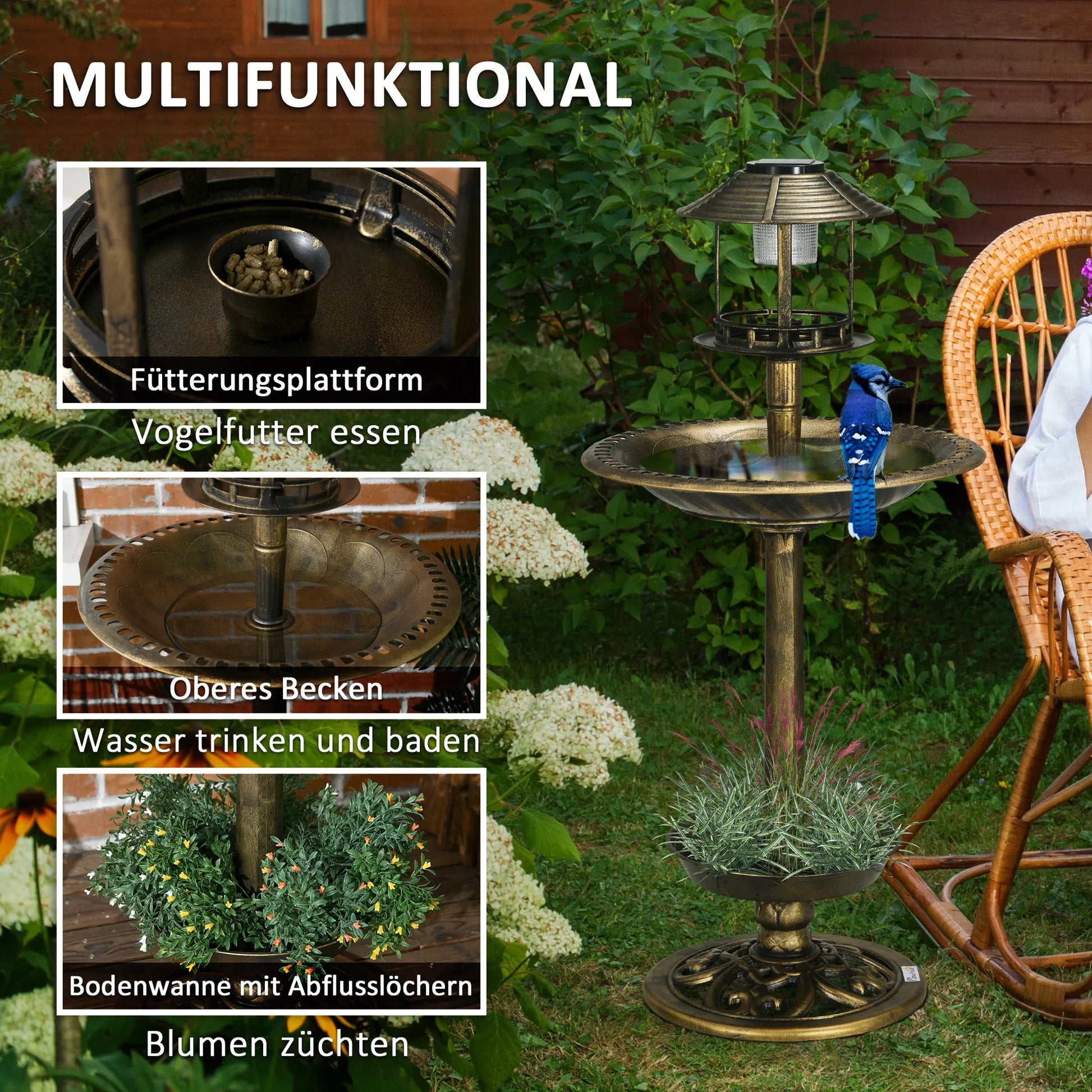 Paukščių girdykla Paukščių namelis Lesyklė, atspari oro sąlygoms, 2 dubenėliai, vintage dizainas, 50 x 50 x 110 cm, bronzos spalvos