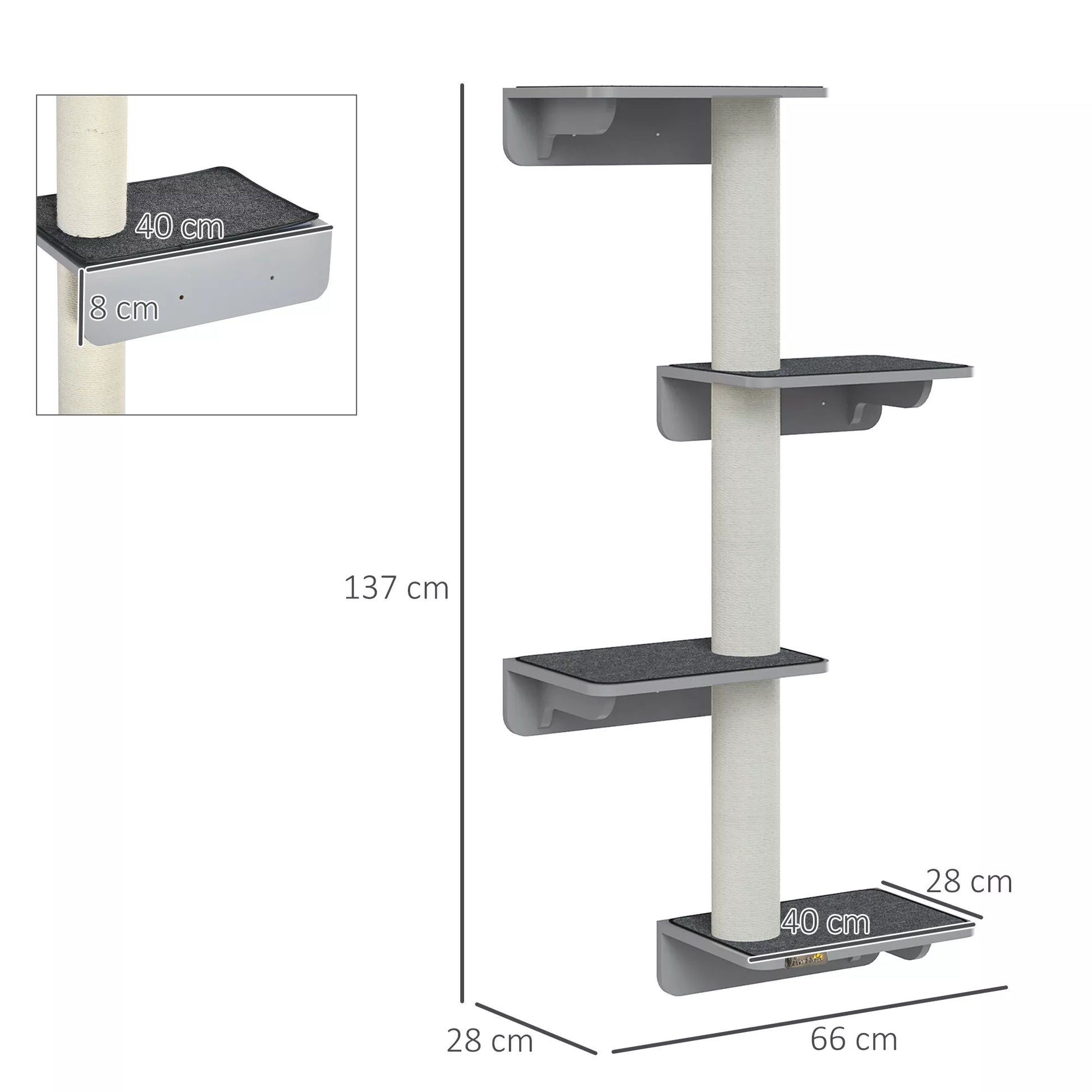 PawHut kaķu skrāpēšanas stabs pie sienas, kaķu kāpšanas siena, kaķu mēbeles pie sienas, jautra kāpšanas vieta kaķiem, stiprināma pie sienas, koka, gaiši pelēka+bēša, 66 x 28 x 137 cm