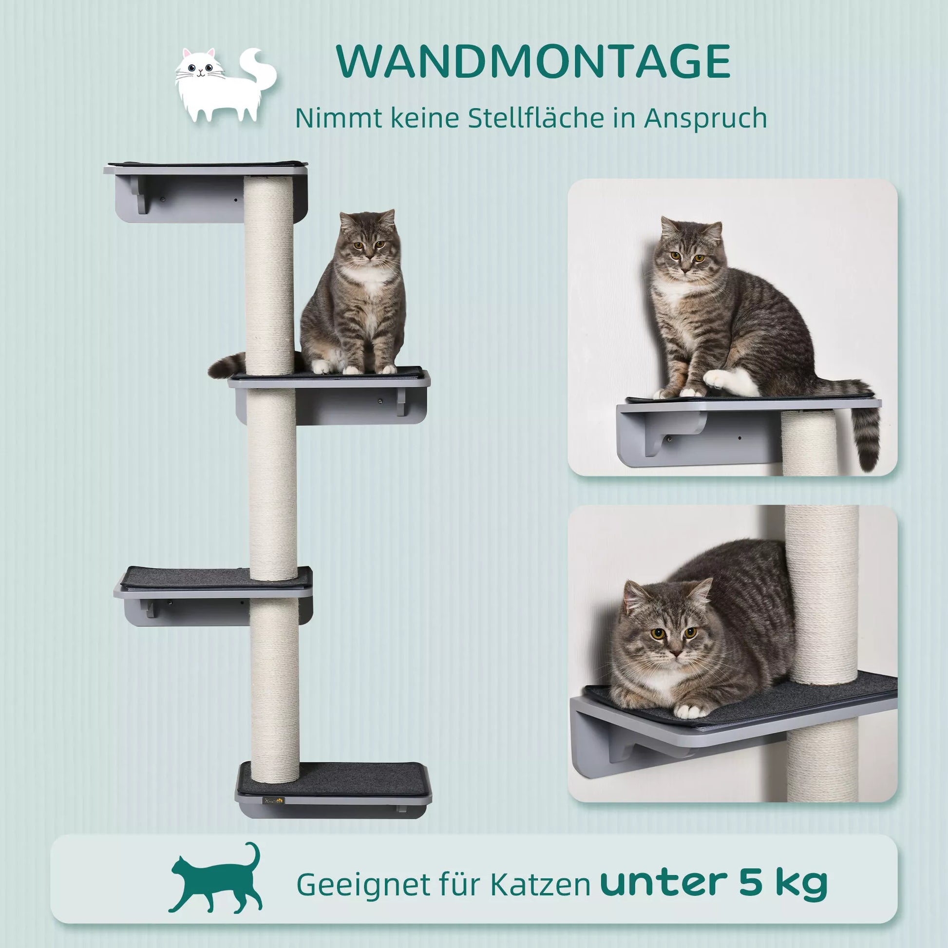 PawHut skrāpējamo stabu var piestiprināt pie sienas, un tas sastāv no 4 lēkāšanas dēļiem un 2 kaķu mājiņām. Izturīgā konstrukcija ir izgatavota no MDF koka un mīksta paklājiņa. Kaķi var spēlēties, lēkāt un atpūsties uz 4 platformām. Skrāpējamais stabs ar džutu dod jūsu kaķim iespēju asināt nagus, tādējādi pasargājot jūsu mēbeles no nevēlamām skrāpējumiem. Šis pie sienas stiprināmais skrāpējamais stabs ir ideāla vieta jūsu kaķiem gulēšanai un rotaļām.