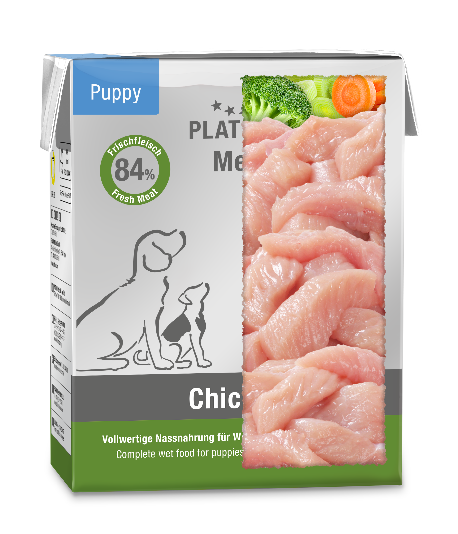 Lēni gatavotas PLATINUM kucēnu pastētes ar vistu mitruma saturs ir 70%, kas ir ideāli piemērota maziem un jauniem suņiem.