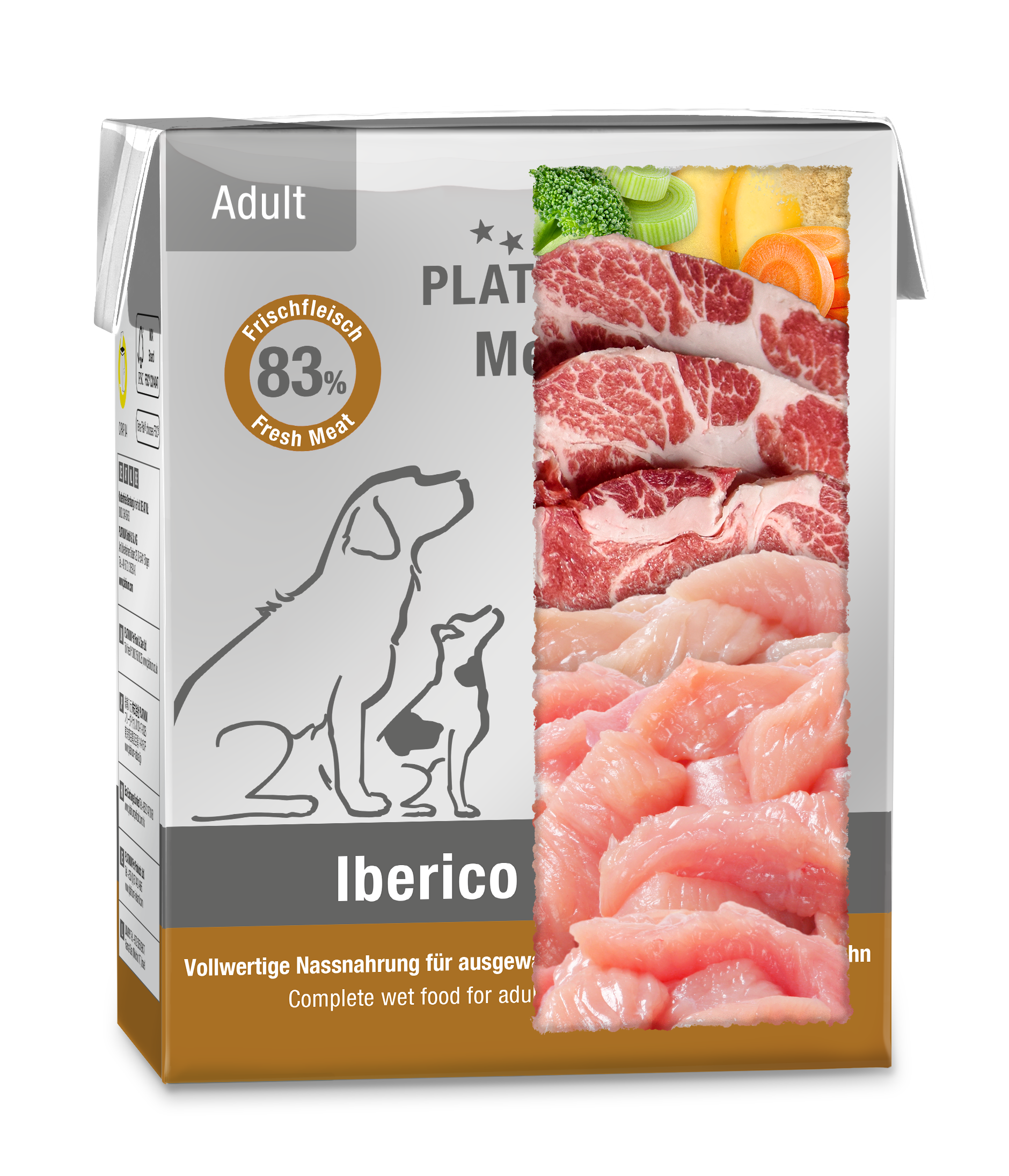Lēni gatavotas, tikai savā sulā, PLATINUM pastētes ar Ibērijas cūkgaļu un tītaru, ar mitruma saturu 69%.