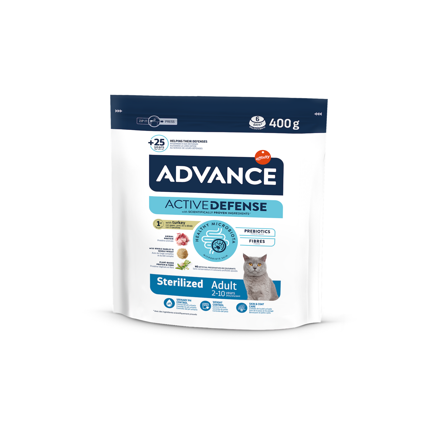 Advance Sterilized Adult sausā barība sterilizētiem pieaugušiem kaķiem ar tītaru un miežiem.