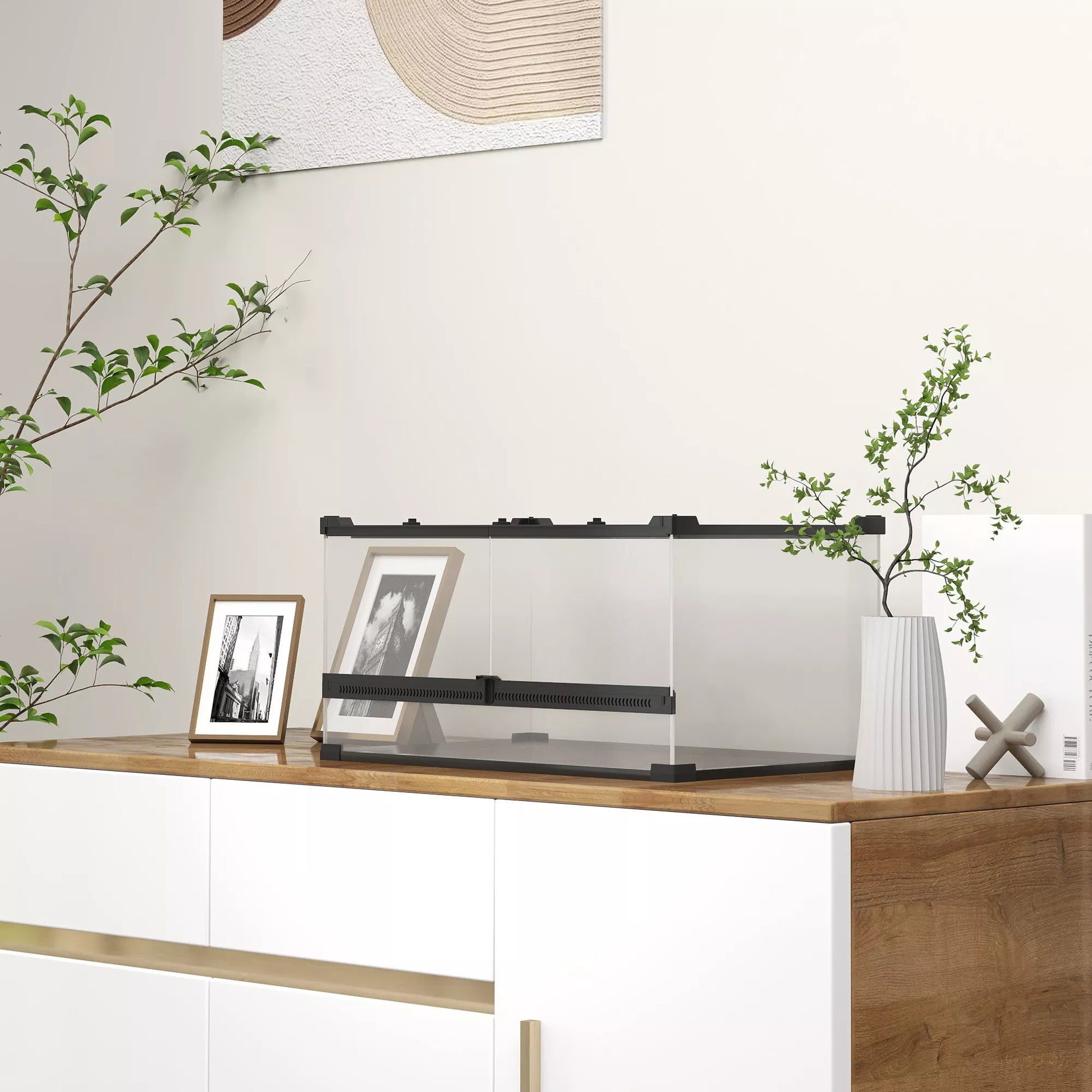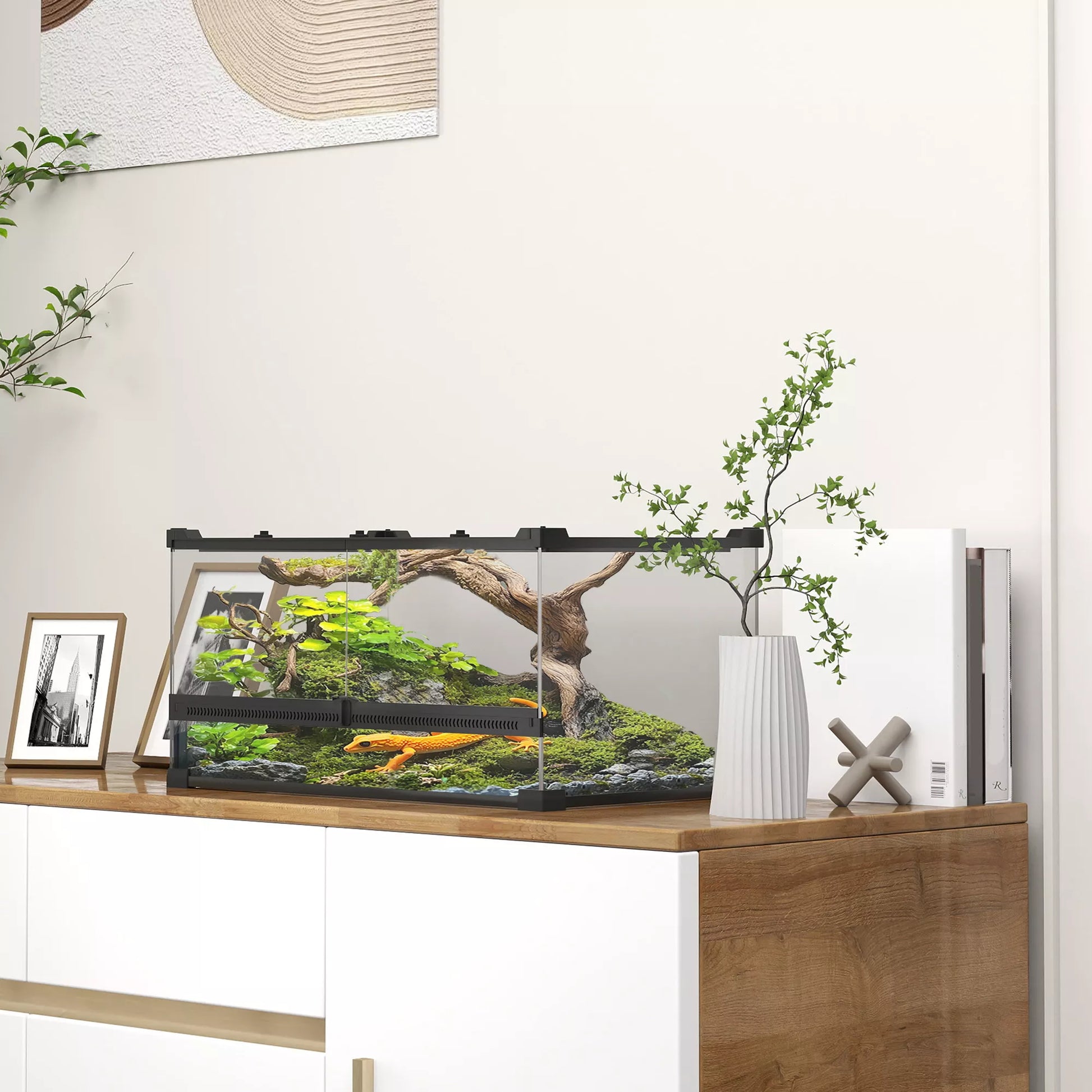 Elegantais stikla vivārijs ļauj novērot savu rāpuli no jebkuras perspektīvas. Pateicoties 360° skatam, jūs vienmēr redzēsiet savu mīluli. Priekšējās durvis ar drošu grozāmu slēdzeni neļauj rāpulim aizbēgt, un sieta jumts nodrošina pastāvīgu svaiga gaisa padevi. Lieliski piemērots čūskām, vardēm, bruņurupučiem un citiem dzīvniekiem.