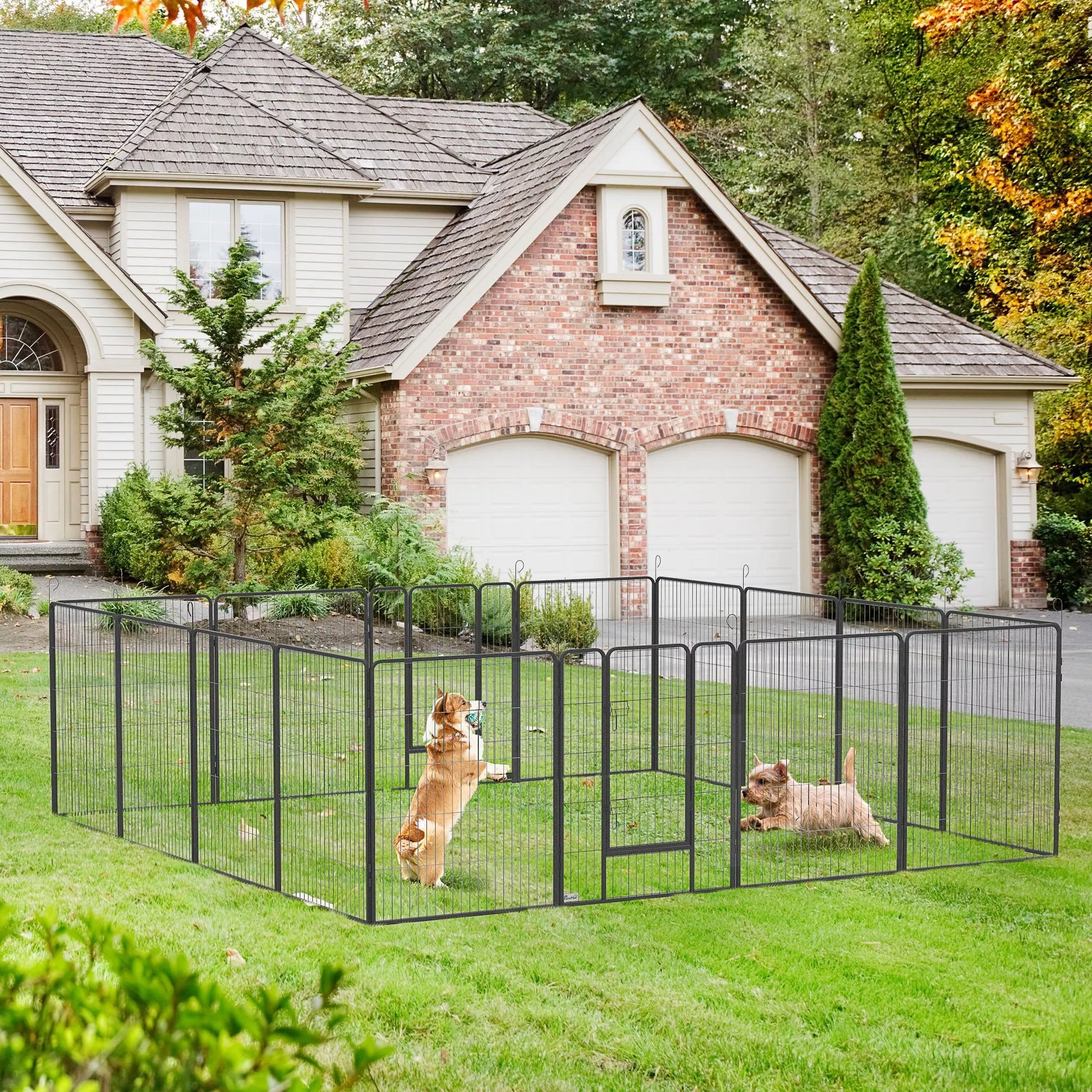 • ✔ Kucēnu aploks, kas izgatavots no 16 sienas elementiem, kurus var uzbūvēt taisnstūra, kvadrāta, L veida vai citās formās