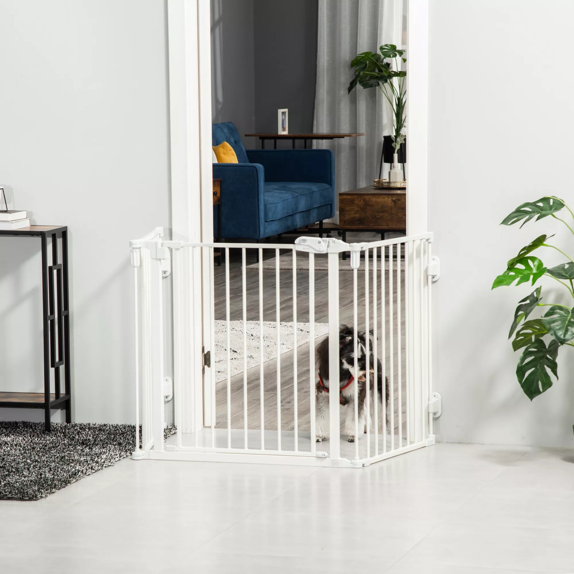 Suņu drošības vārti, durvju un mājdzīvnieku drošības vārti, regulējami, salokāmi, kamīna vārti ar pašaizverošām durvīm, 3 paneļi, krāsnij, stiprināmi pie sienas/brīvi stāvoši, balti, 202,5 x 76 cm