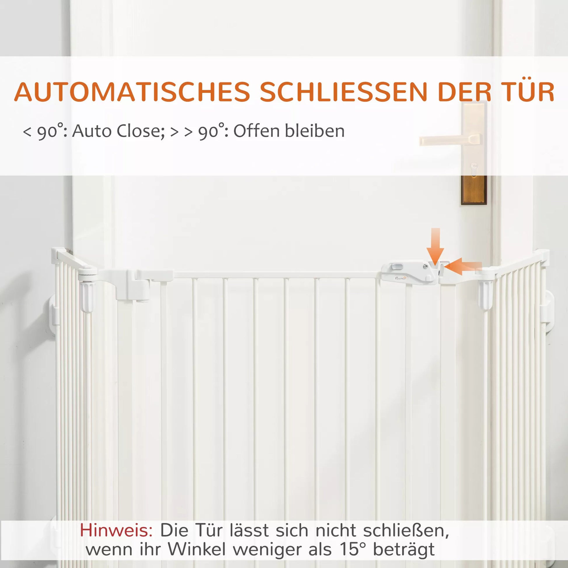 - ✔ Durvis automātiski aizveras, ja atvēršanas leņķis ir mazāks par 90°, un paliek atvērtas, ja leņķis ir lielāks par 90°. (Durvis neaizveras, ja leņķis ir mazāks par 15°.)