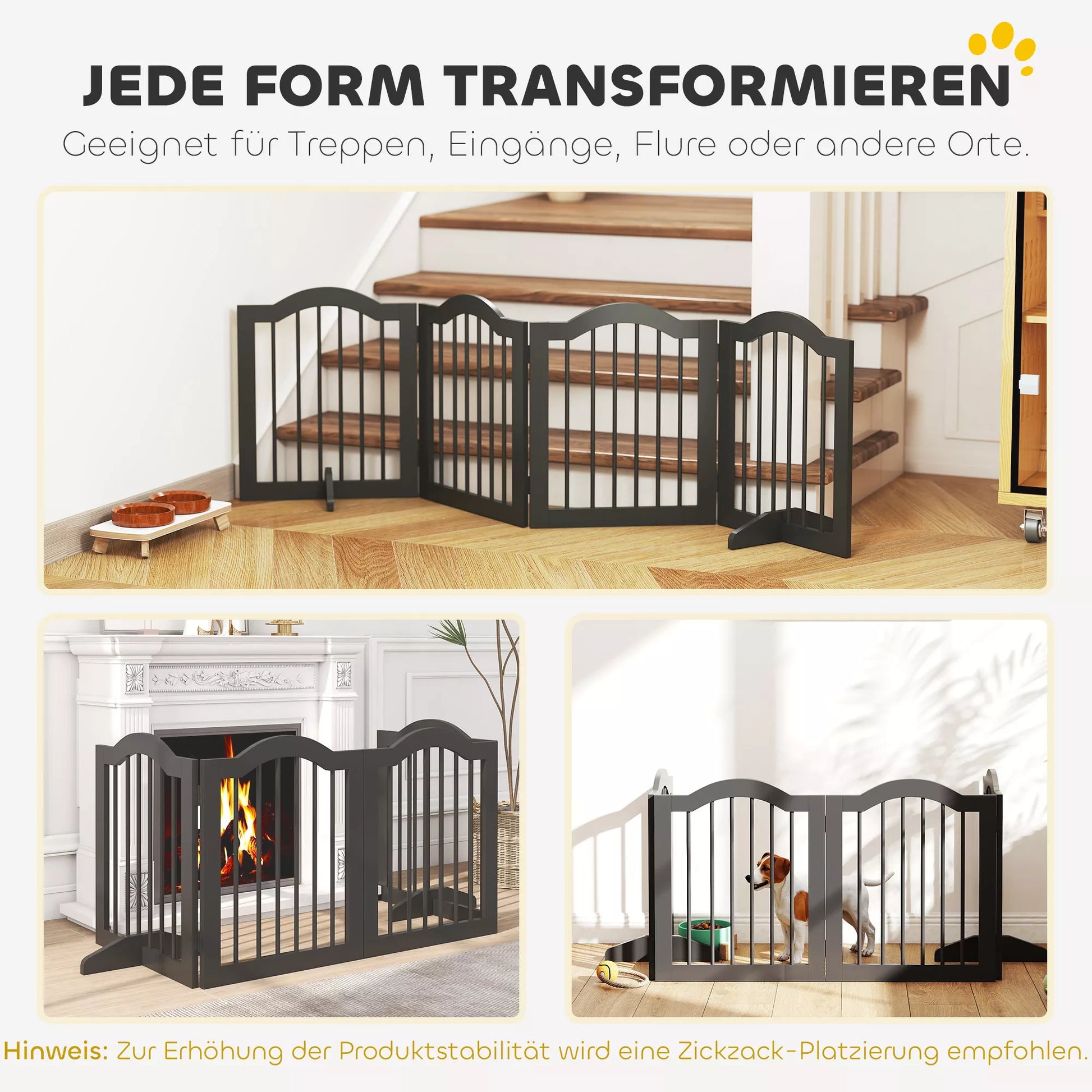 Nodrošiniet drošību un komfortu ar suņu vārtiem. Ideāli piemēroti kāpnēm, ieejām vai kā žogs iekštelpām — jūsu suns vienmēr atradīsies savā drošajā zonā. Žoga stabilās atbalsta kājas garantē stingru satvērienu, un elastīgie savienojumi ļauj pielāgoties jebkurām durvju ailei. Aizsargājiet savu māju un savu četrkājaino draugu ar šo daudzpusīgo un izturīgo žogu. Uzticieties sava mājdzīvnieka drošībai!