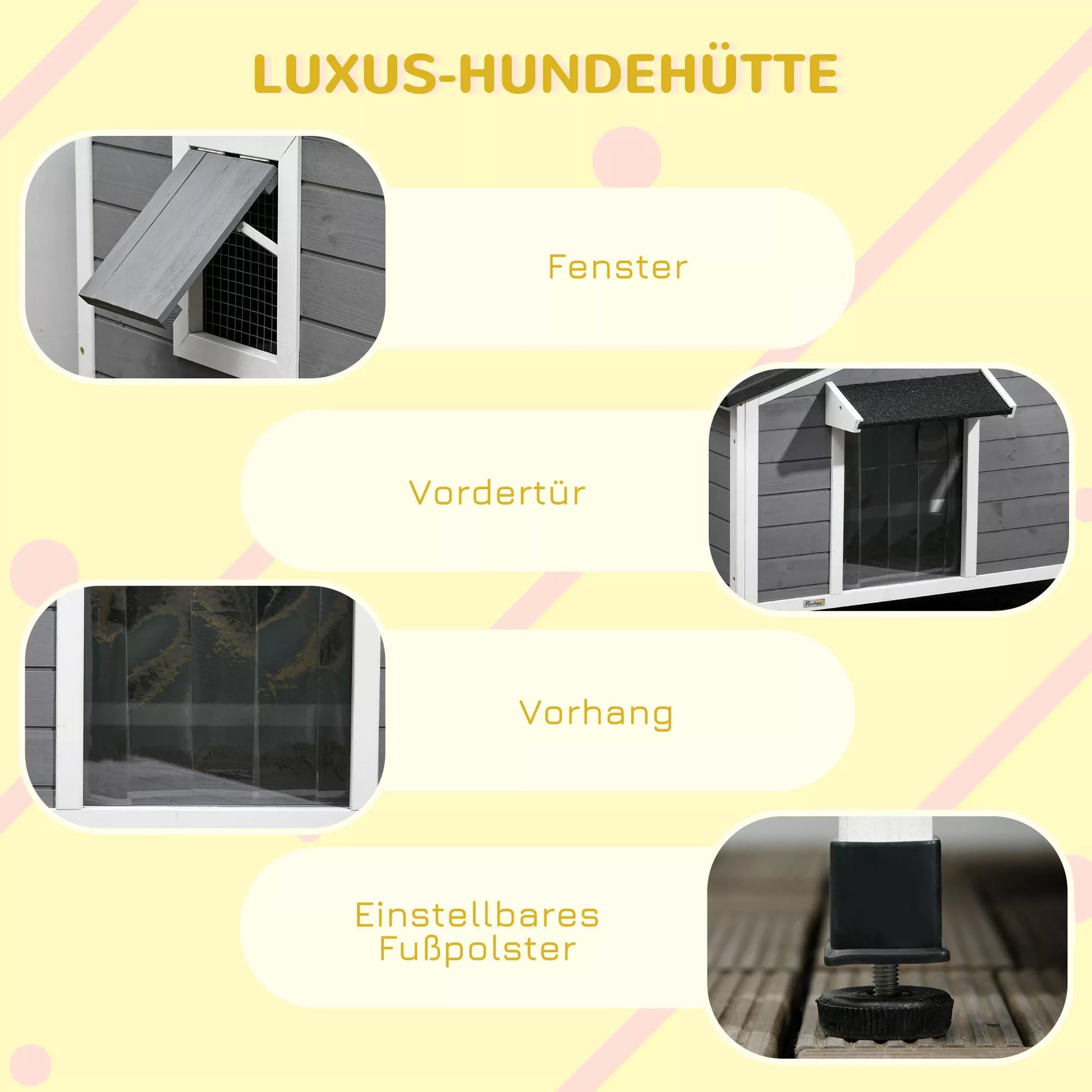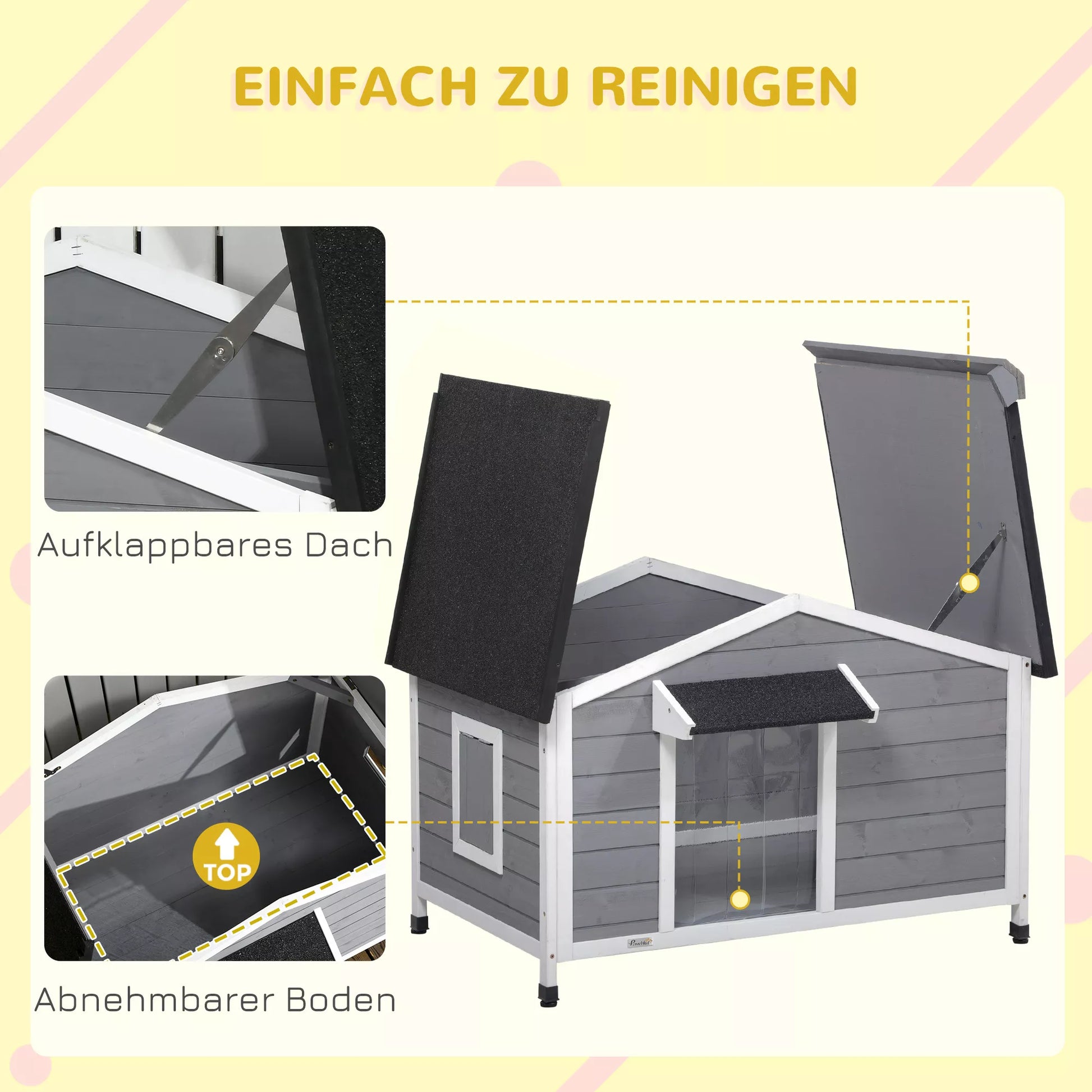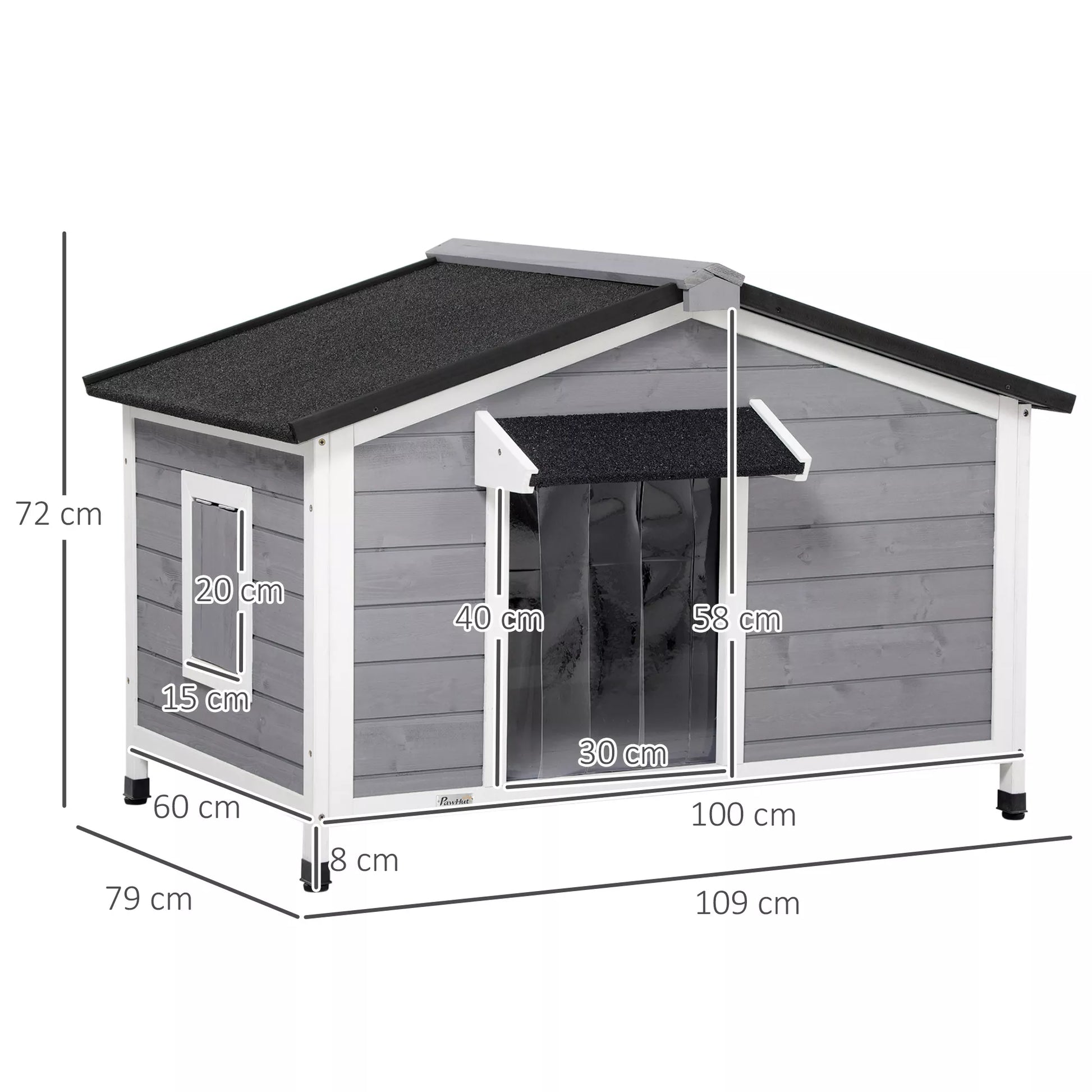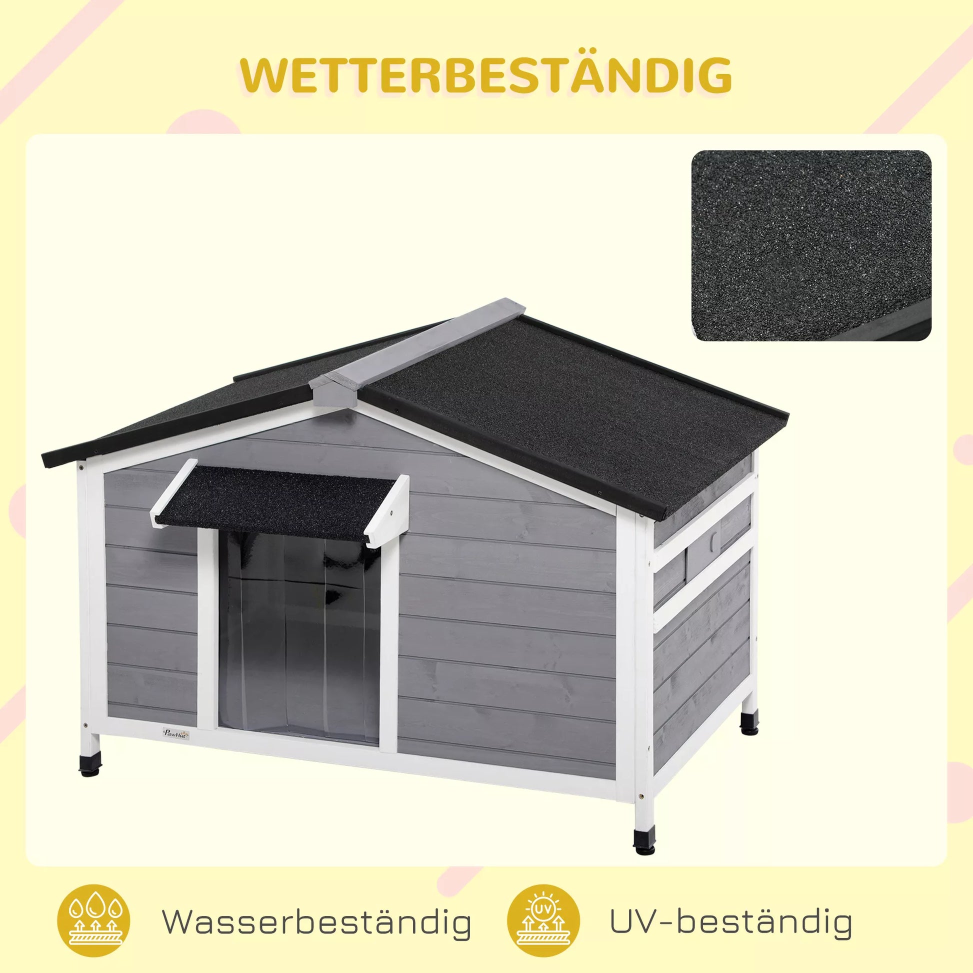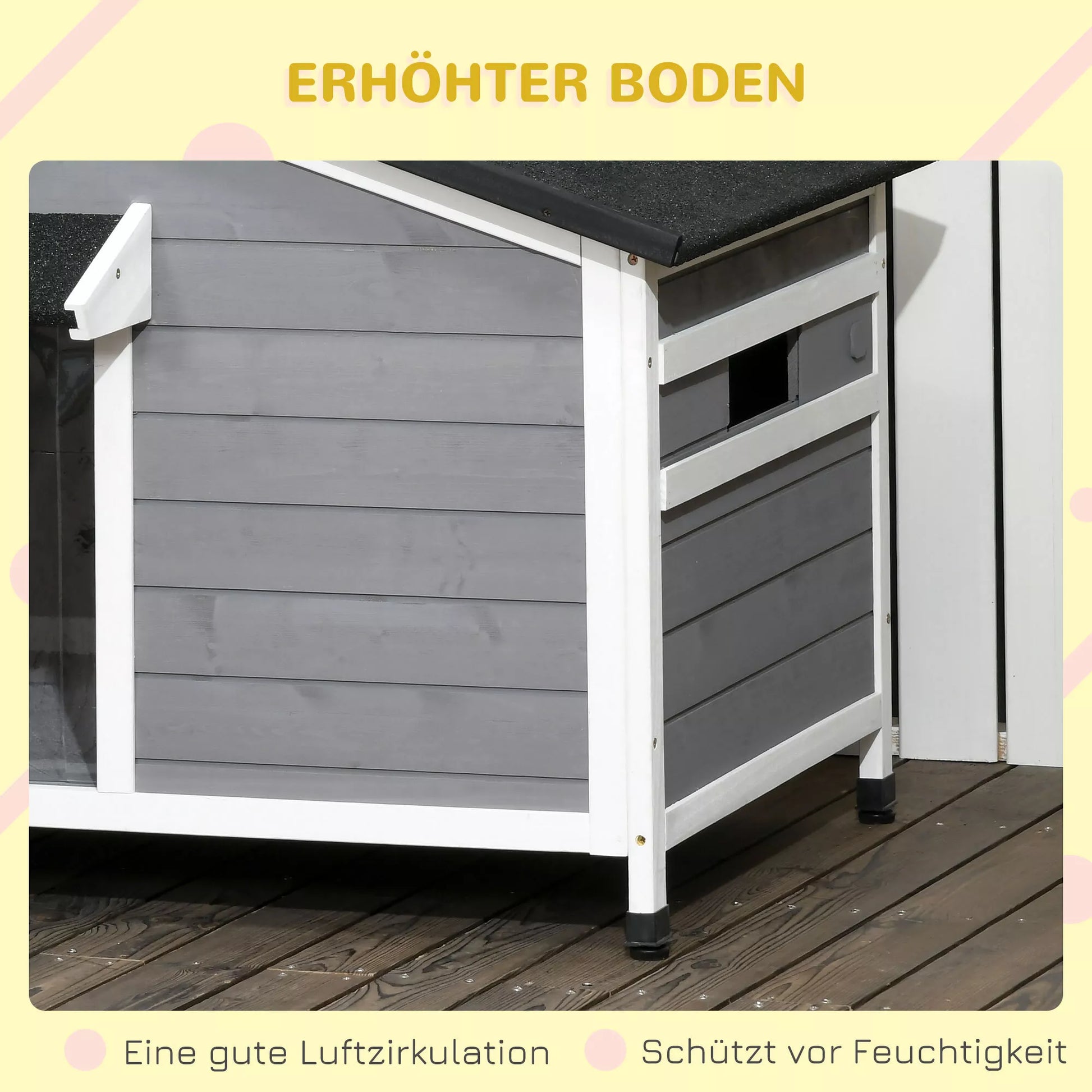 Suņu voljērs no masīvkoka, izturīgs pret laikapstākļiem, ar asfalta jumtu, noņemamu pamatni, 109 cm x 79 cm x 72 cm, pelēks + balts