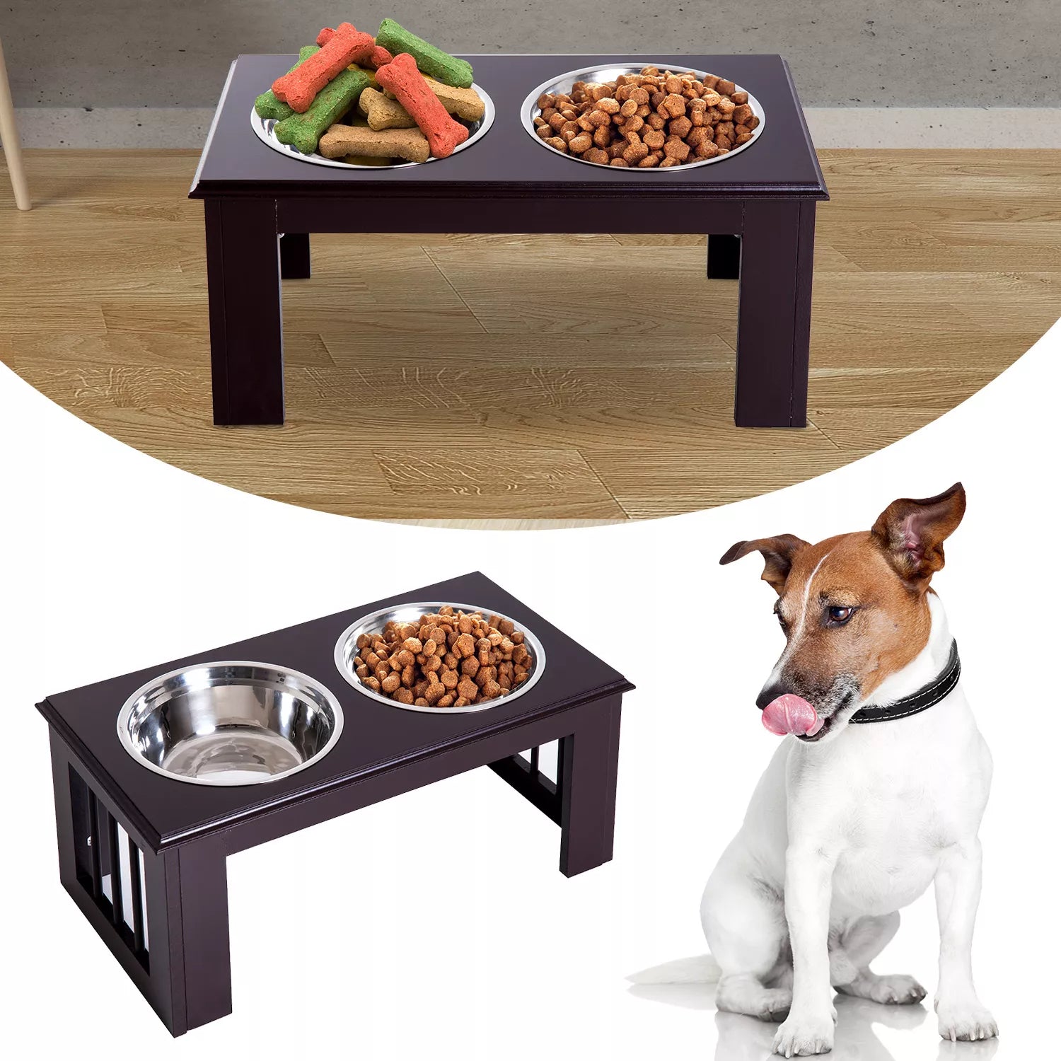 Palutiniet savus četrkājainos draugus ar mūsu stilīgo suņu barotavu. Šī stacija ir aprīkota ar izturīgu MDF korpusu un divām augstas kvalitātes nerūsējošā tērauda bļodām. Tās ir ne tikai nerūsējošas un viegli tīrāmas, bet arī ārkārtīgi higiēniskas un drošas jūsu mājdzīvniekam. Paaugstinātā pozīcija nodrošina ērtāku barošanas pozīciju un uztur barību tīru. Neaizstājams palīgs katrā mājā ar suņiem.