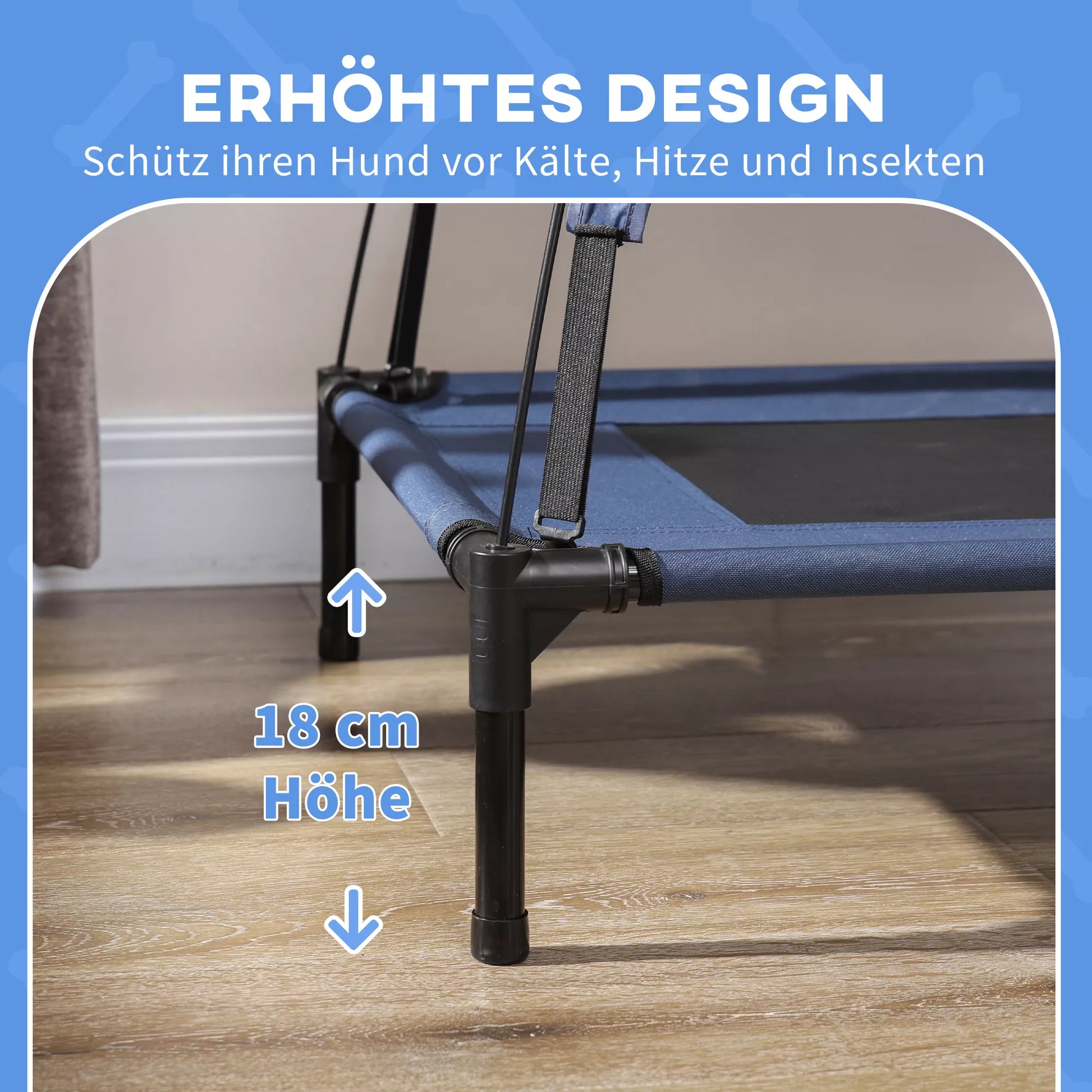 Suņu gulta ar nojumi, āra suņu gulta, saliekama, paaugstināta konstrukcija, zila + melna