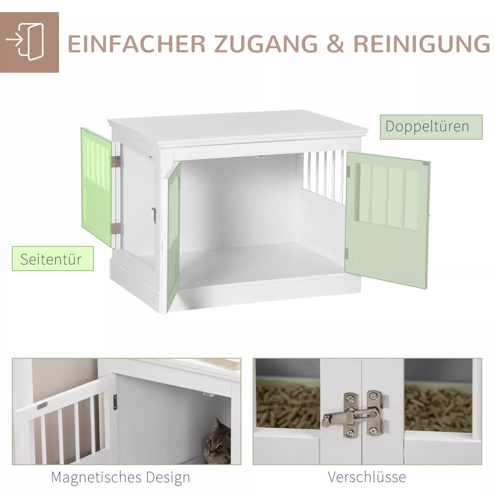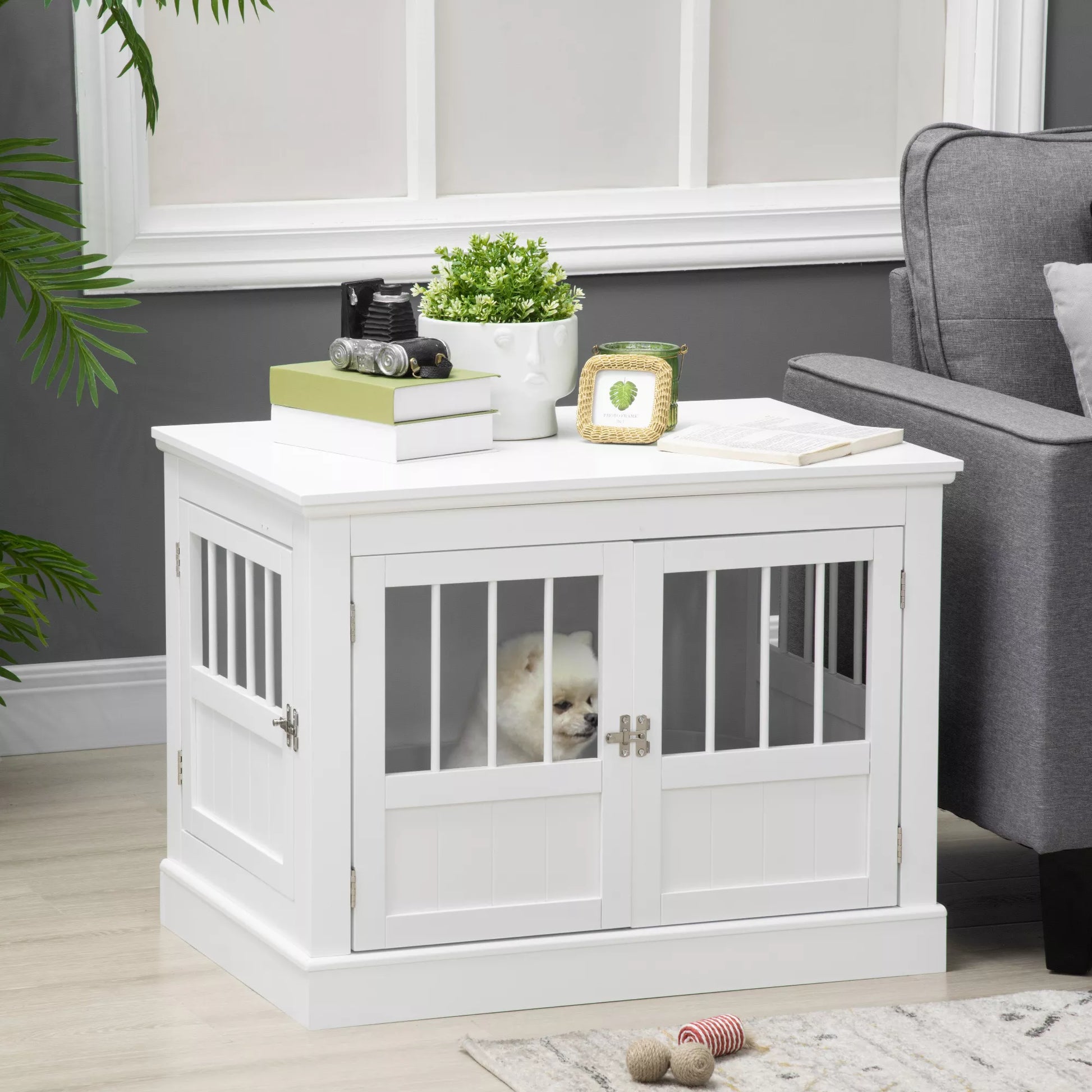 Šis suņu būris nodrošina plašu, līdzenu virsmu jūsu mājas baudīšanai. Suņu būra trīs durvis ļauj viegli atvērt slēdzenes no vairākām pusēm, lai jūs varētu ērti izlaist savu suni. Ar drošo " " mēbeļu stila suņu būri jūs pārliecināsieties, cik ātri aizveras magnētiskā slēdzene, ietaupot jūsu laiku un pūles.