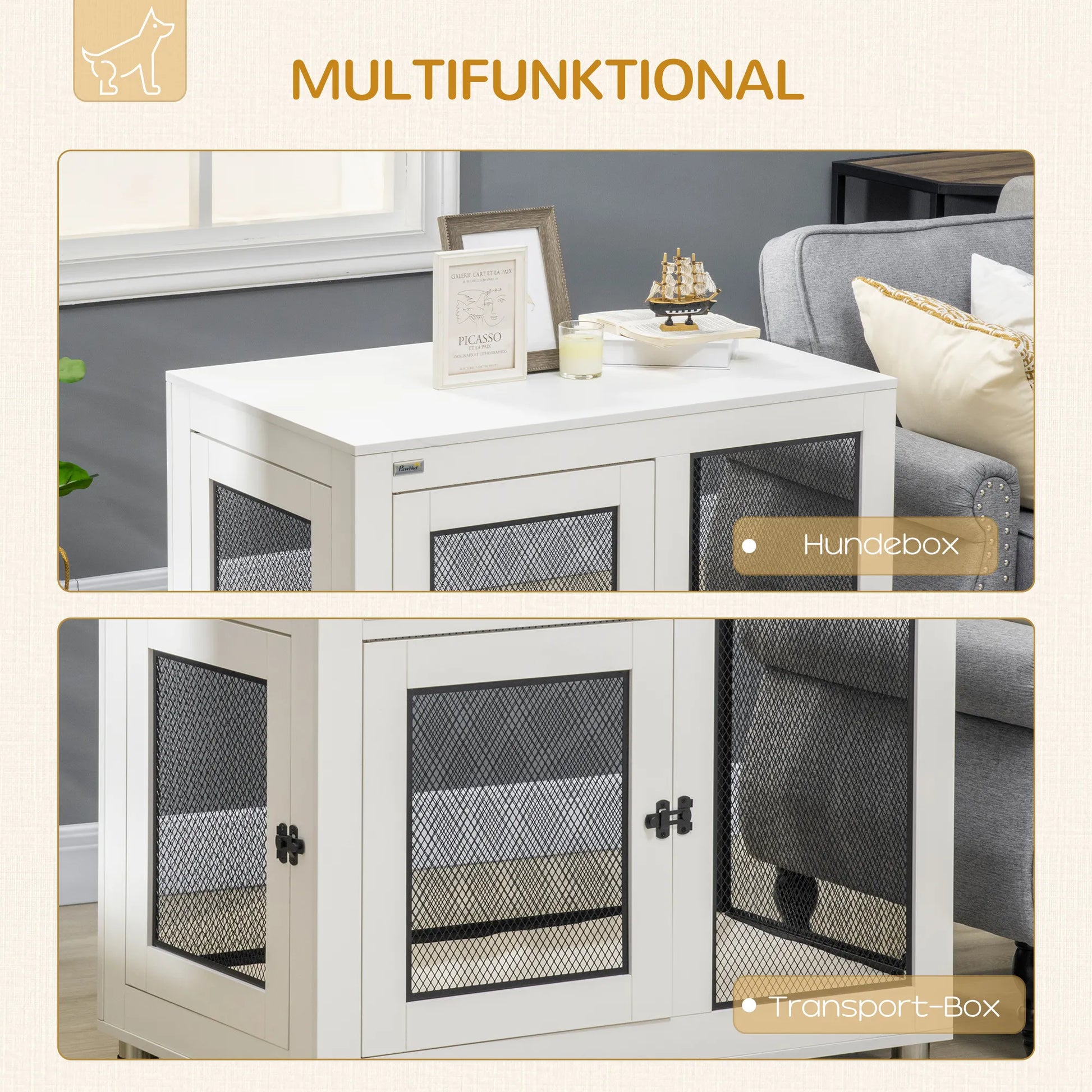 Šis dekoratīvais suņu būris nodrošinās jūsu mazajiem mājdzīvniekiem lielisku miega komfortu, pateicoties tā mājīgajam, mīkstajam matracim ar noņemamu un veļas mašīnā mazgājamu pārvalku. Divas aizslēdzamas durvis un smalks tērauda siets neļauj kucēniem aizbēgt un nonākt bīstamās situācijās. Tādā veidā jūsu kucēni var augt droši un labi aprūpēti.