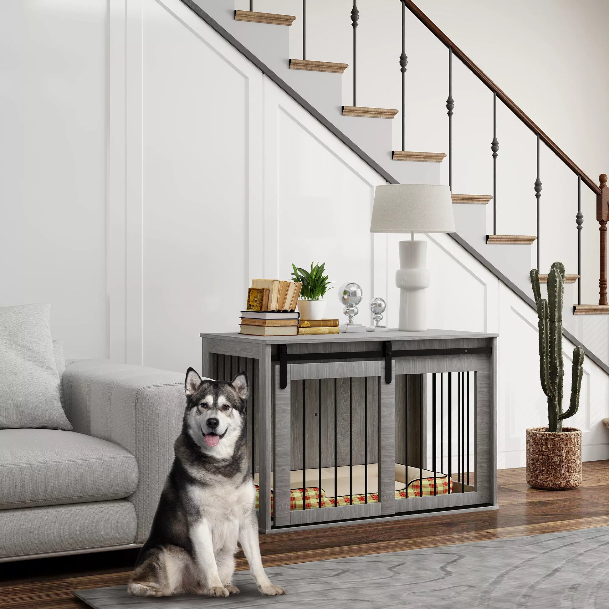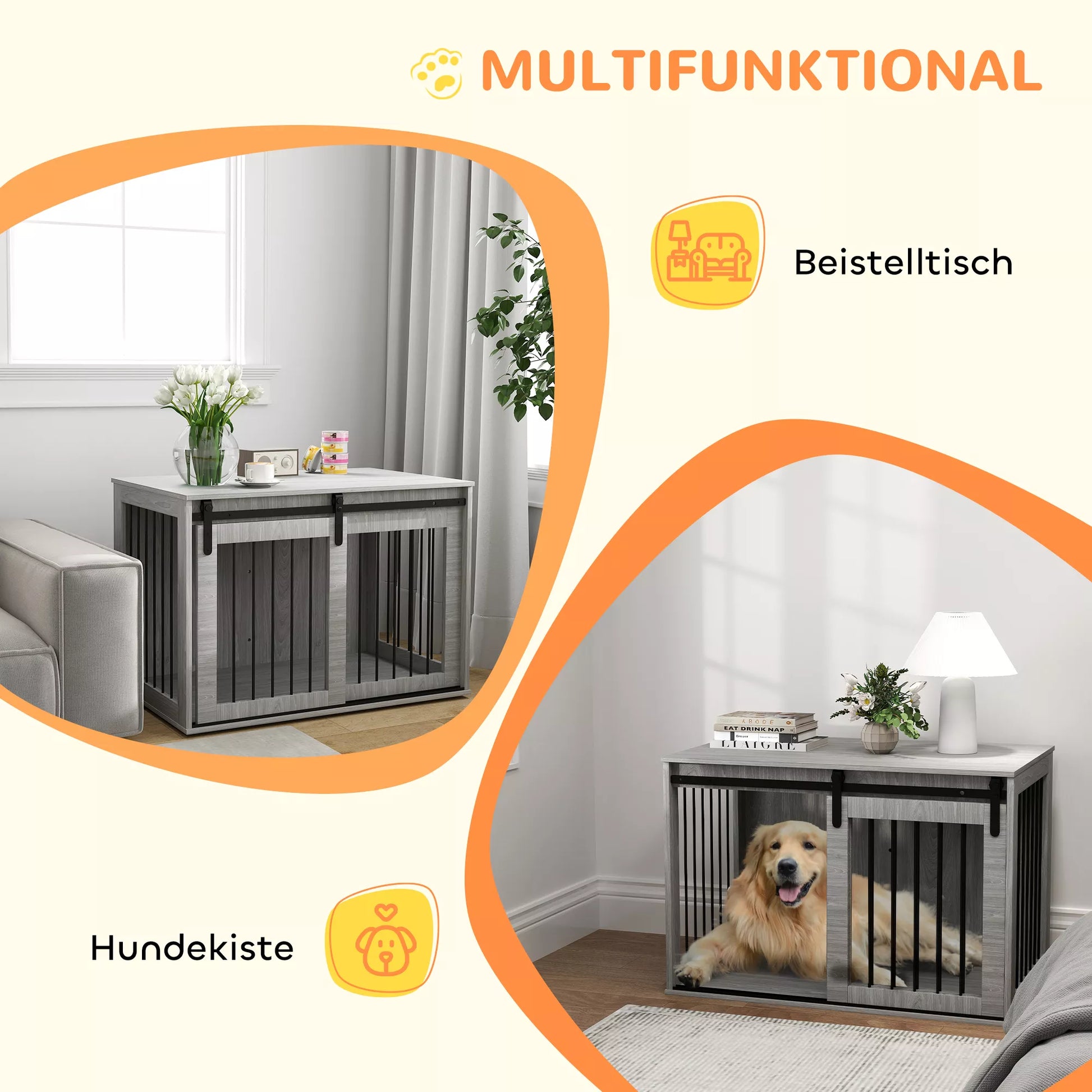 - ✔ Suņu būris ir izgatavots no skaidu plātnes un tērauda, nodrošinot stabilitāti