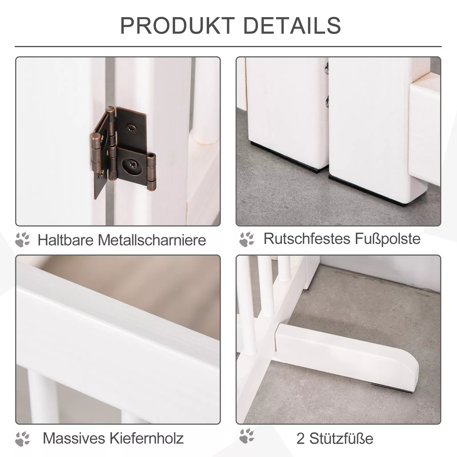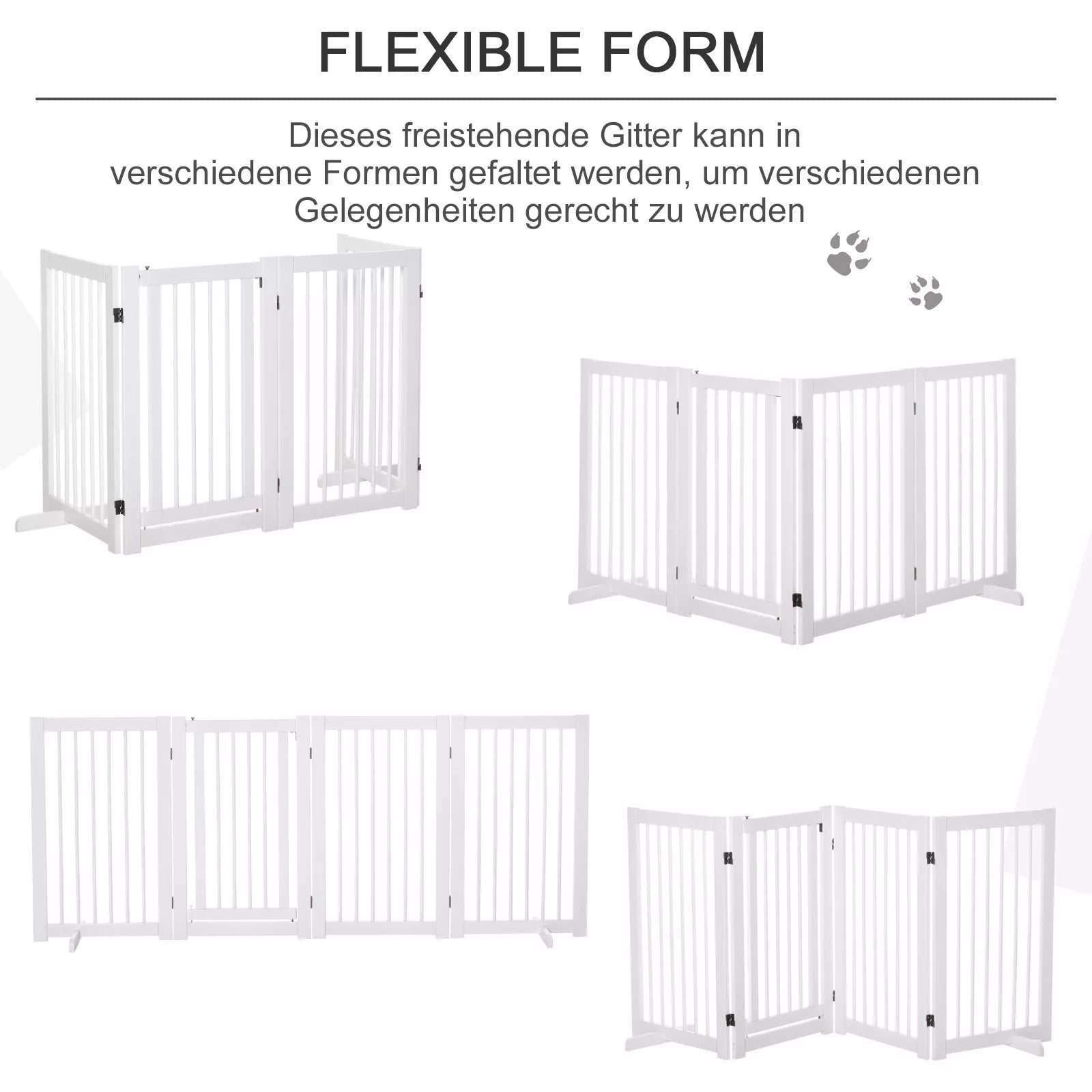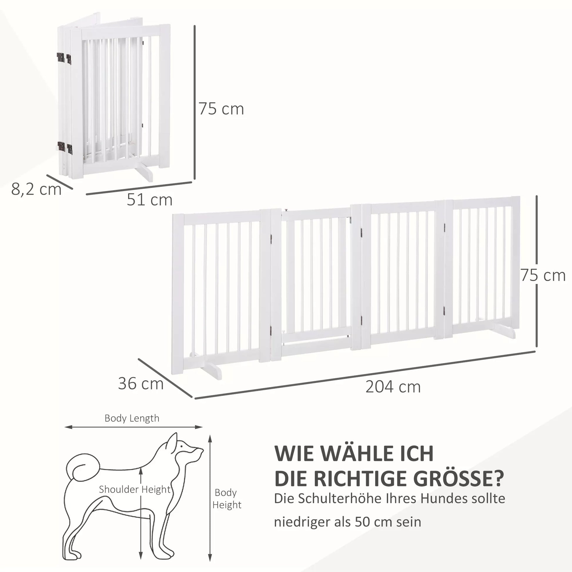 Suņu vārti, 4 daļas, 204 x 75 cm, salokāmi drošības vārti ar durvīm, brīvi stāvoši suņu vārti ar 2 atbalsta kājām, koka vārti kāpnēm, gaitenim, virtuvei, balti