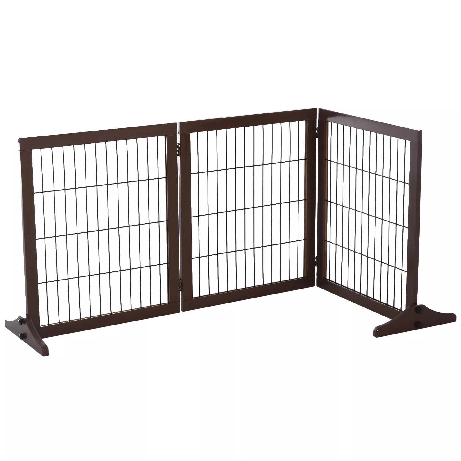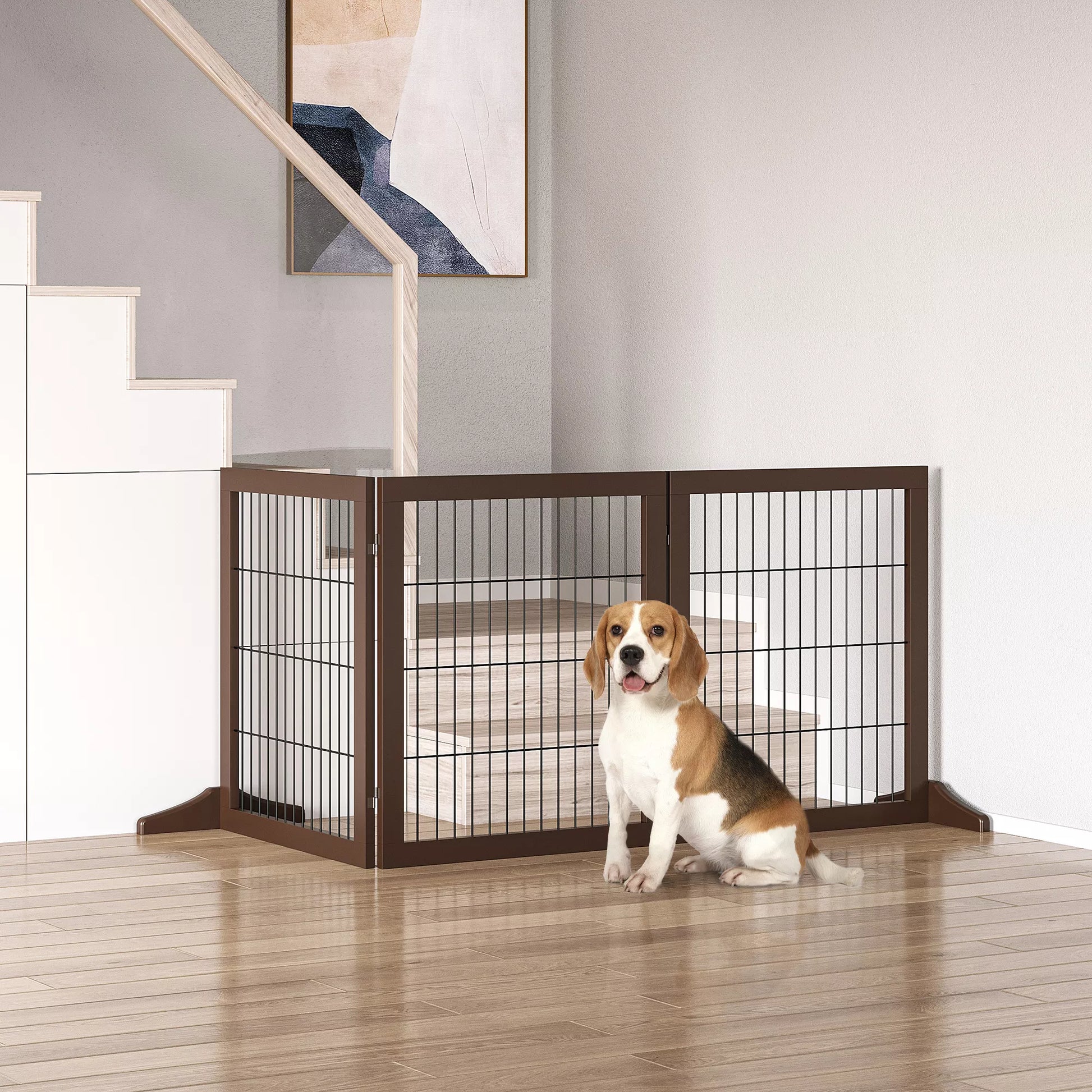 Suņu barjeras / Brīvi stāvošs drošības žogs ar kājām 185 x 71 cm koka suņu žogs, kāpņu aizsargs, kāpņu barjera, suņu barjera kāpnēm, durvīm, virtuvei, koridoram, 3 paneļi, brūns
