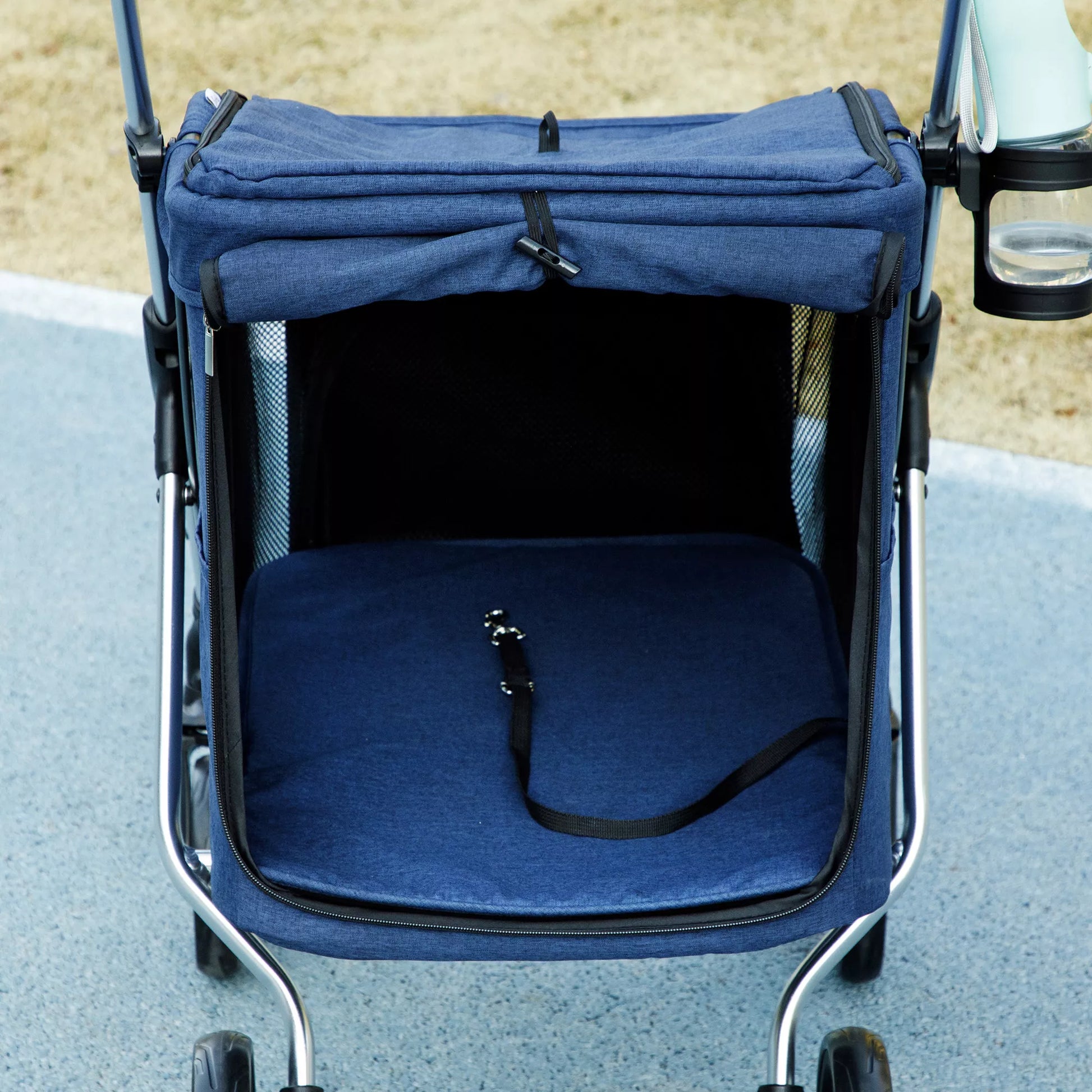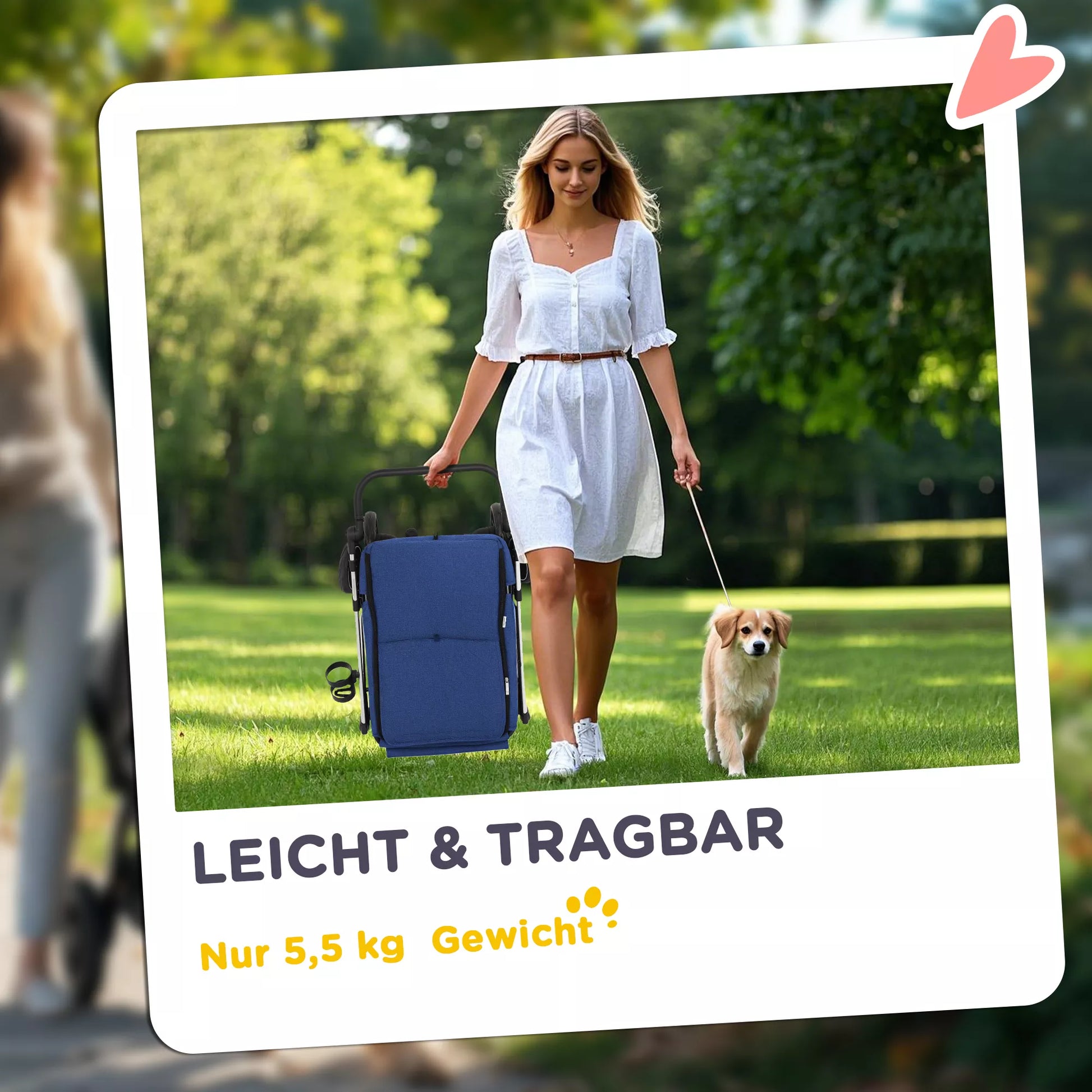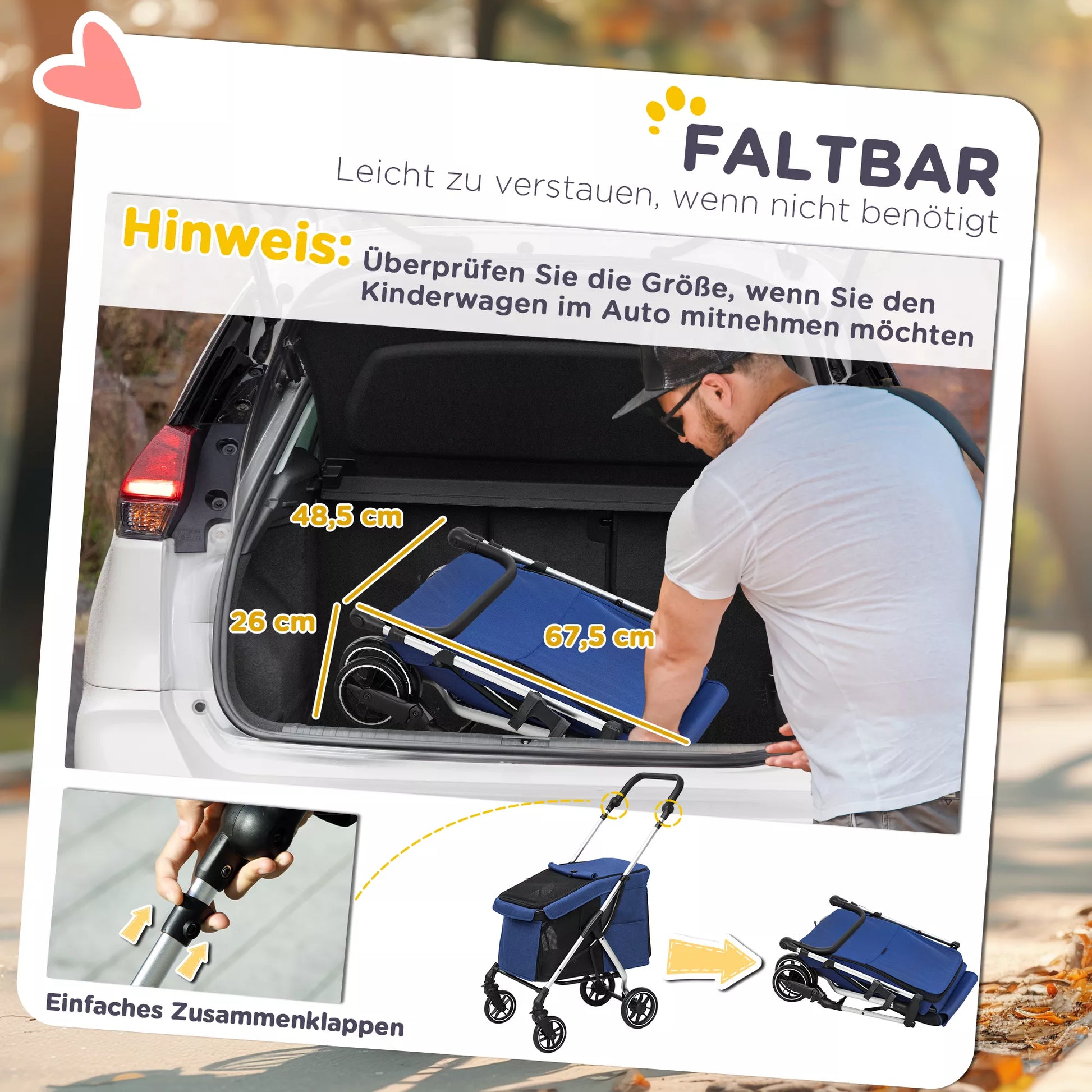 Suņu ratiņi, viegli un salokāmi transportēšanas ratiņi maziem suņiem, mazgājams spilvens, sieta logs, tumši zils